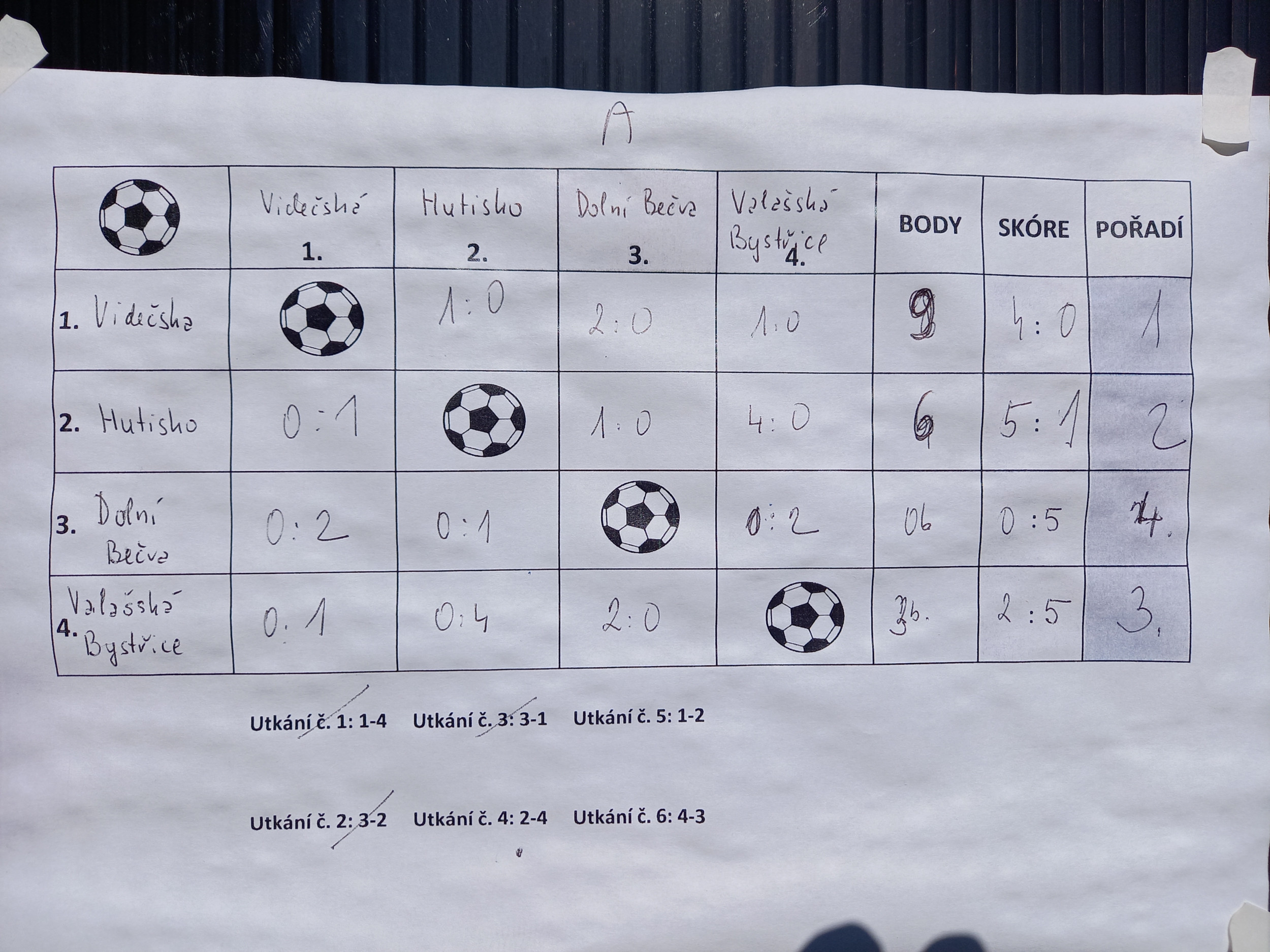První zápas proti ZŠ Videčská nakonec i přes velký závěrečný tlak skončil 0:1. V dalším zápase jsme nastoupili proti ZŠ Hutisko-Solanec a tento zápas byl bohužel hlavně v režii soupeře, který se na konci zápasu radoval z výhry 4:0. K poslednímu zápasu ve skupině jsme nastoupili proti ZŠ Dolní Bečva a v tomto zápase náš tým prolomil do té doby střeleckou smůlu. V zápase padly 2 góly a oba vstřelili naši borci (1. Pomkla S.; 2. Fusek Š.), a tak se naši mohli radovat z první výhry v turnaji. Jedna výhra ve skupině nám zajistila postup do boje o 5. místo.