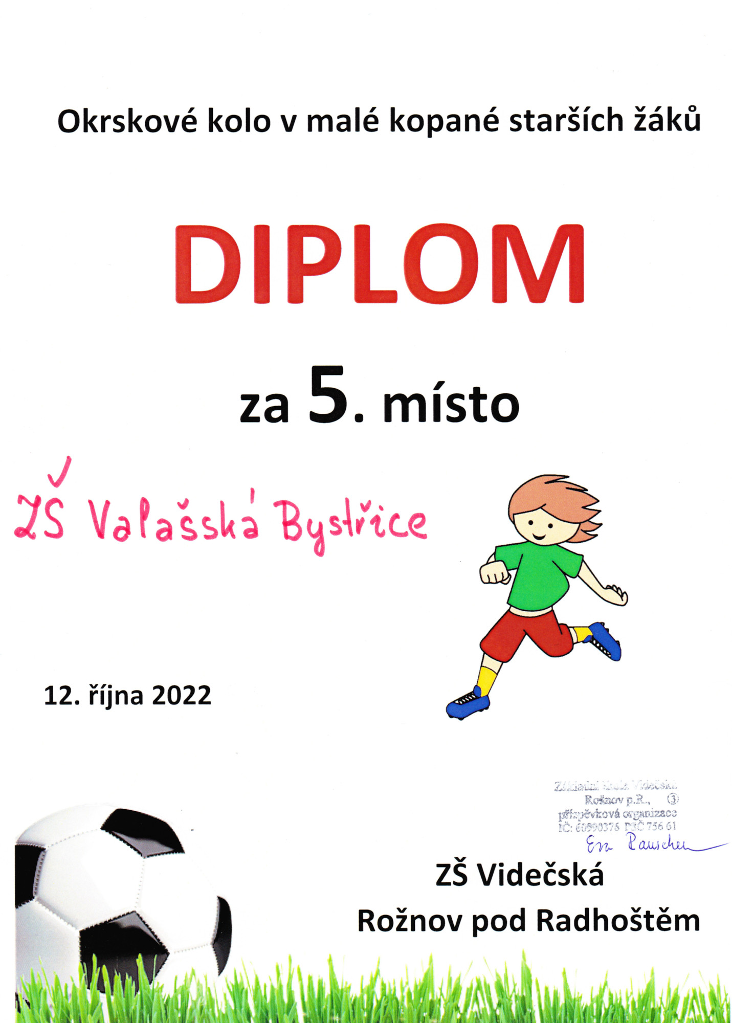 Ve středu 12. 10. 2022 se uskutečnilo v Rožnově pod Radhoštěm okrskové kolo ve fotbale, kde naši školu reprezentovali vybraní chlapci ze 7., 8. a 9. tříd. Turnaje se zúčastnilo celkem 9 týmů, náš tým ve skupině postupně narazil na týmy ze základních škol Videčská, Hutiska-Solance a Dolní Bečvy.