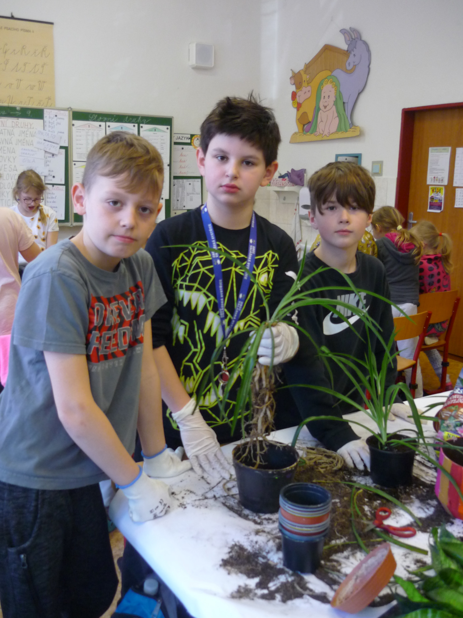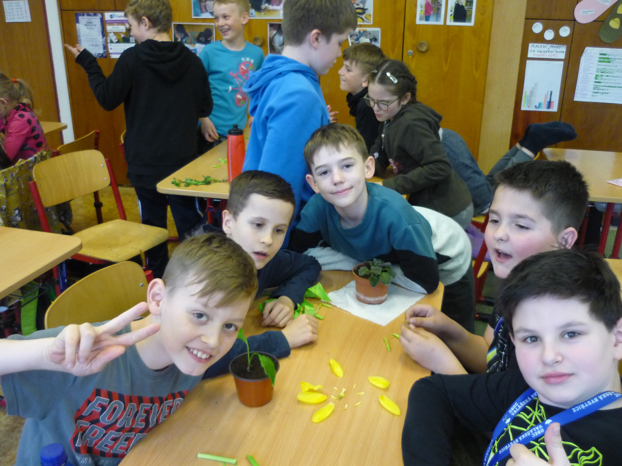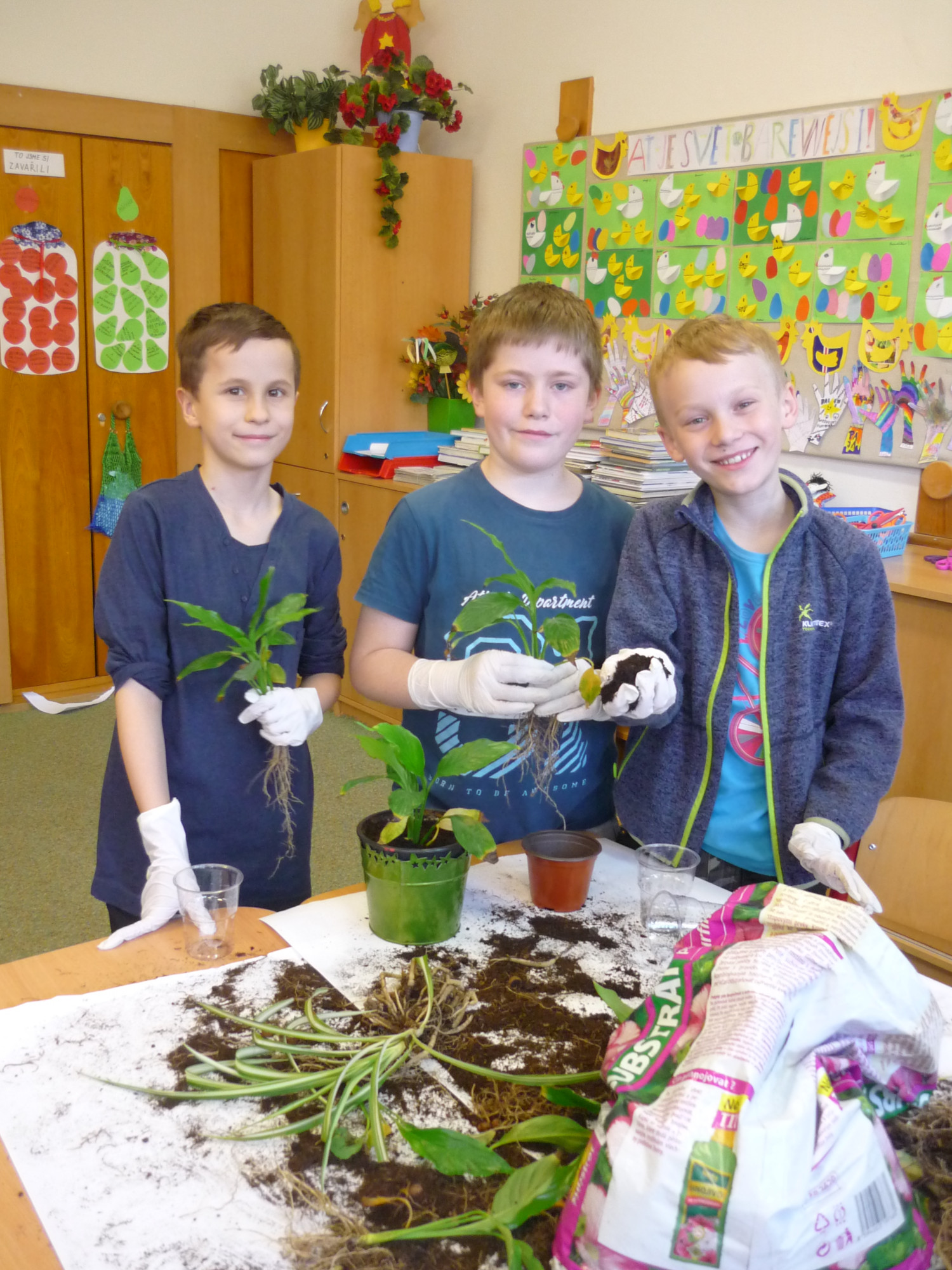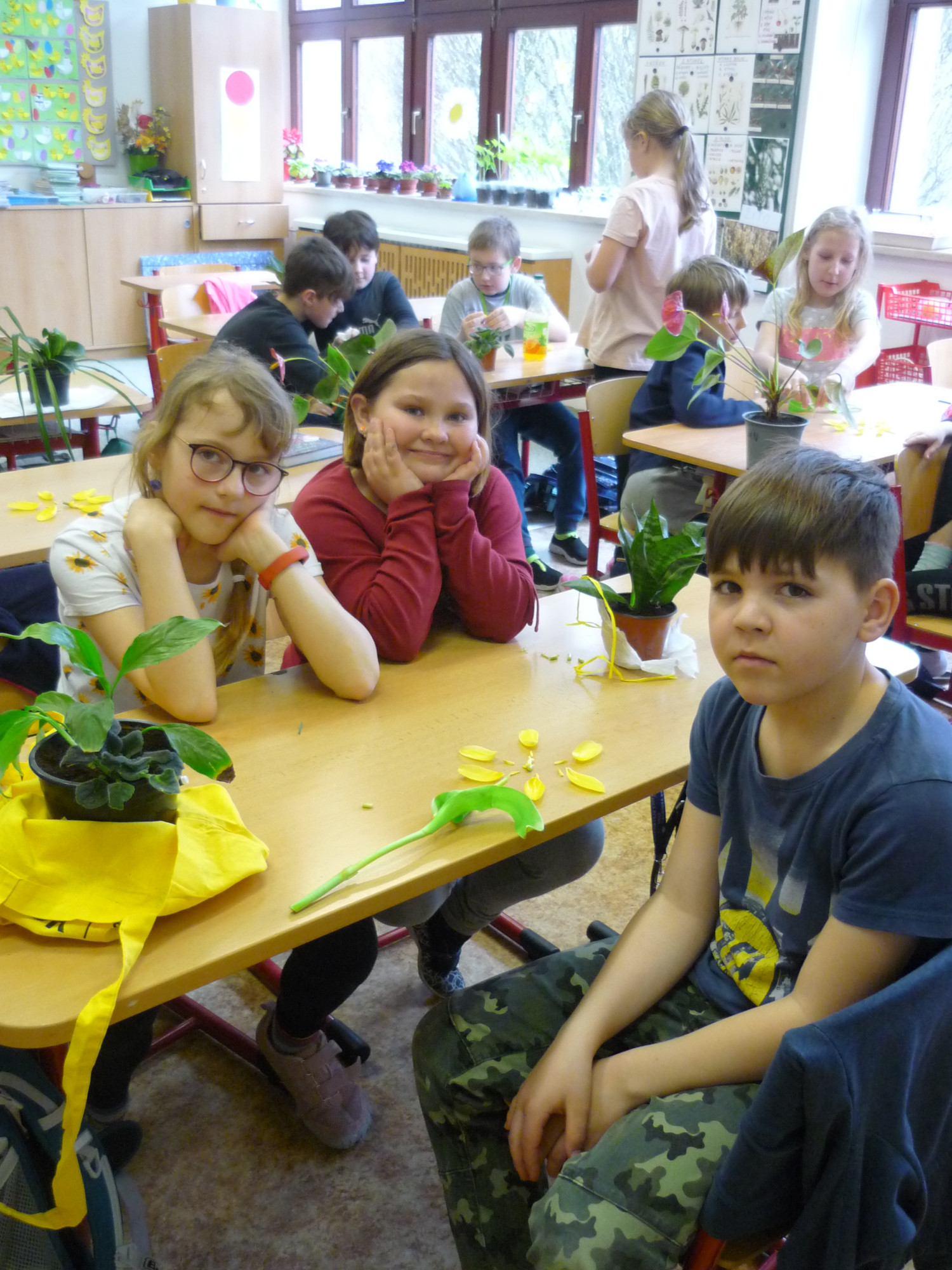 V pátek 21. dubna se žáci 3. třídy těšili na Květinový den. Hned ráno si z přinesených rostlin udělali výstavku, kterou doplnili jejich názvy. Potom se všichni pustili do přesazování pokojových rostlin. Na školním pozemku děvčata i chlapci zaseli hrách a ředkvičku, také zasadili narcisy, petrklíče, rozchodník, z léčivek mátu a meduňku. Z nasbíraných kopřiv a sedmikrásek si pak uvařili dobrý čaj. Domů všichni odcházeli s úsměvem a s kytkou v květináči.