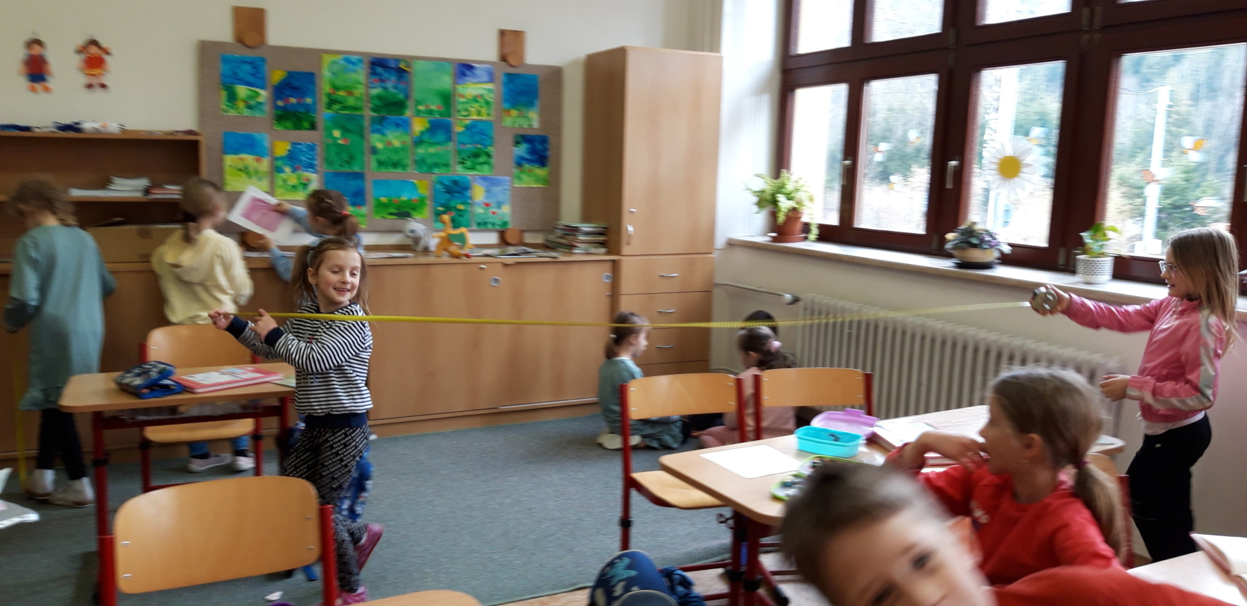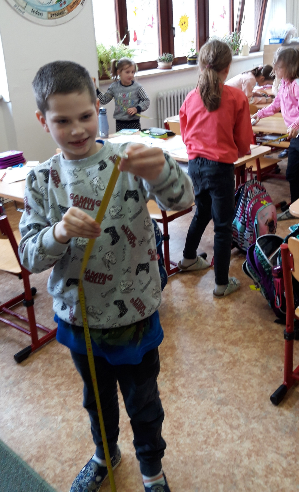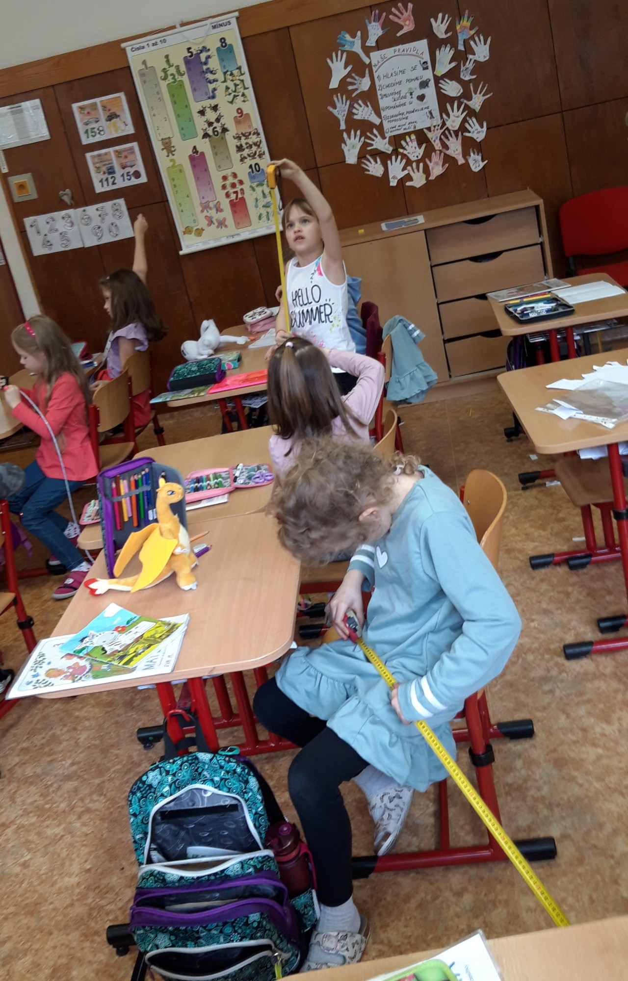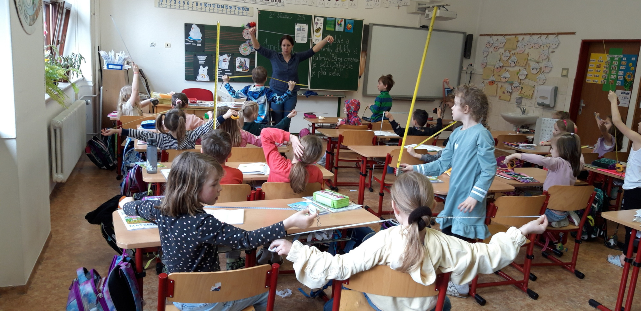 Prvňáčci se v průběhu března seznamovali s délkovou mírou. Měřili různými typy metrů a to jak ve třídě tak ale i venku. Zkusili změřit například: délku třídy, lavice, učebnice, kroku a nebo vlastního hodu kriketovým míčkem.