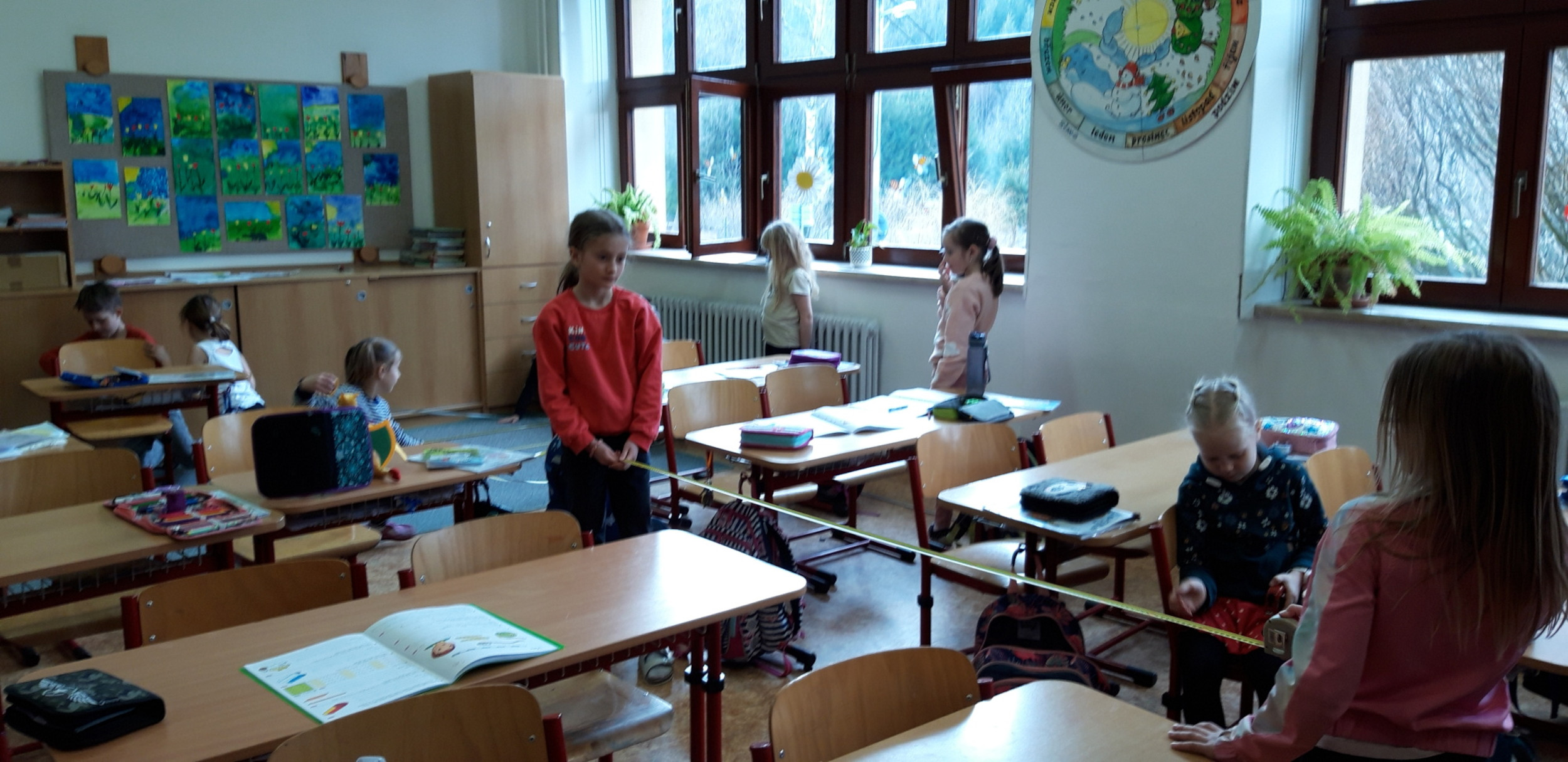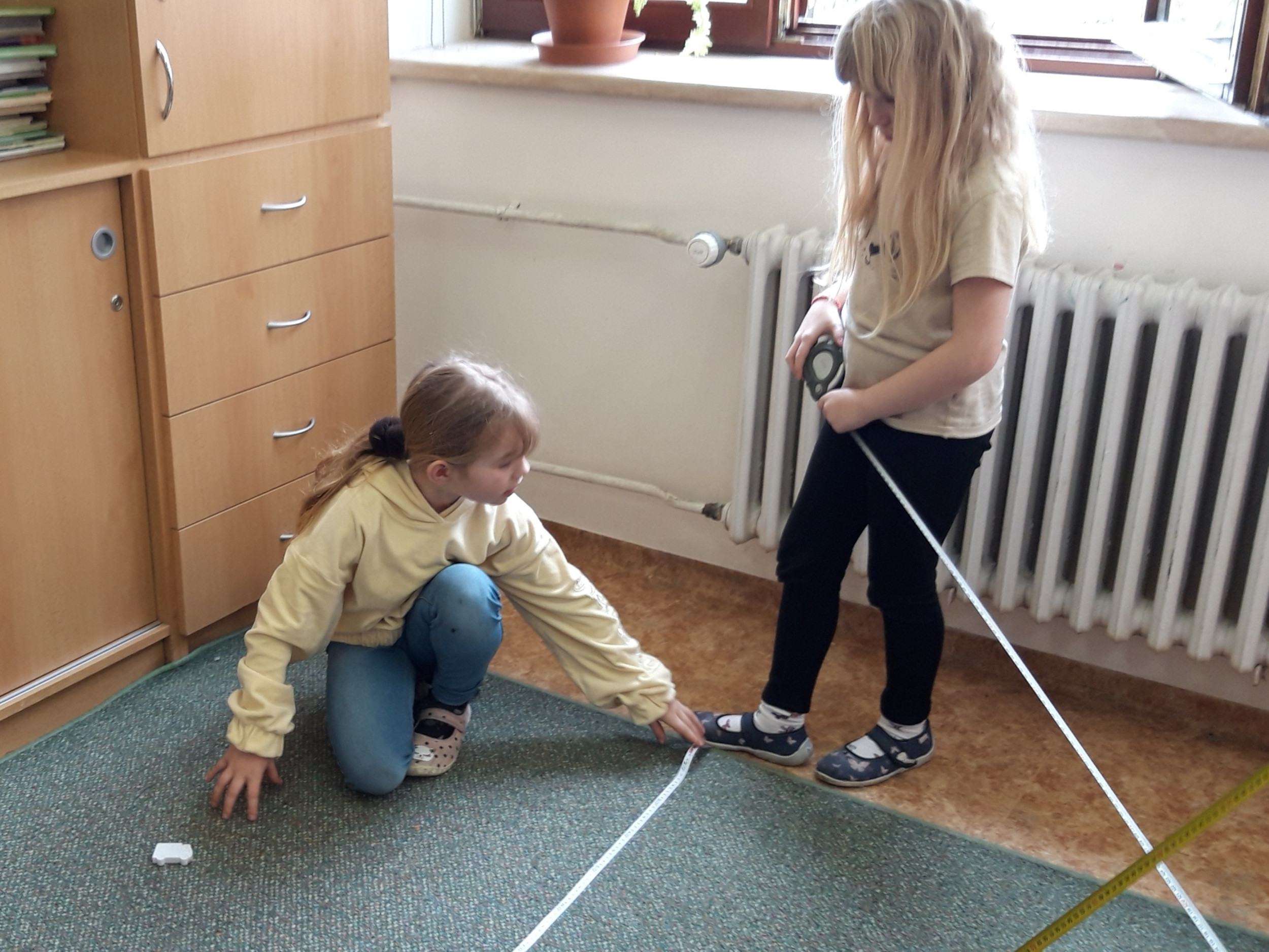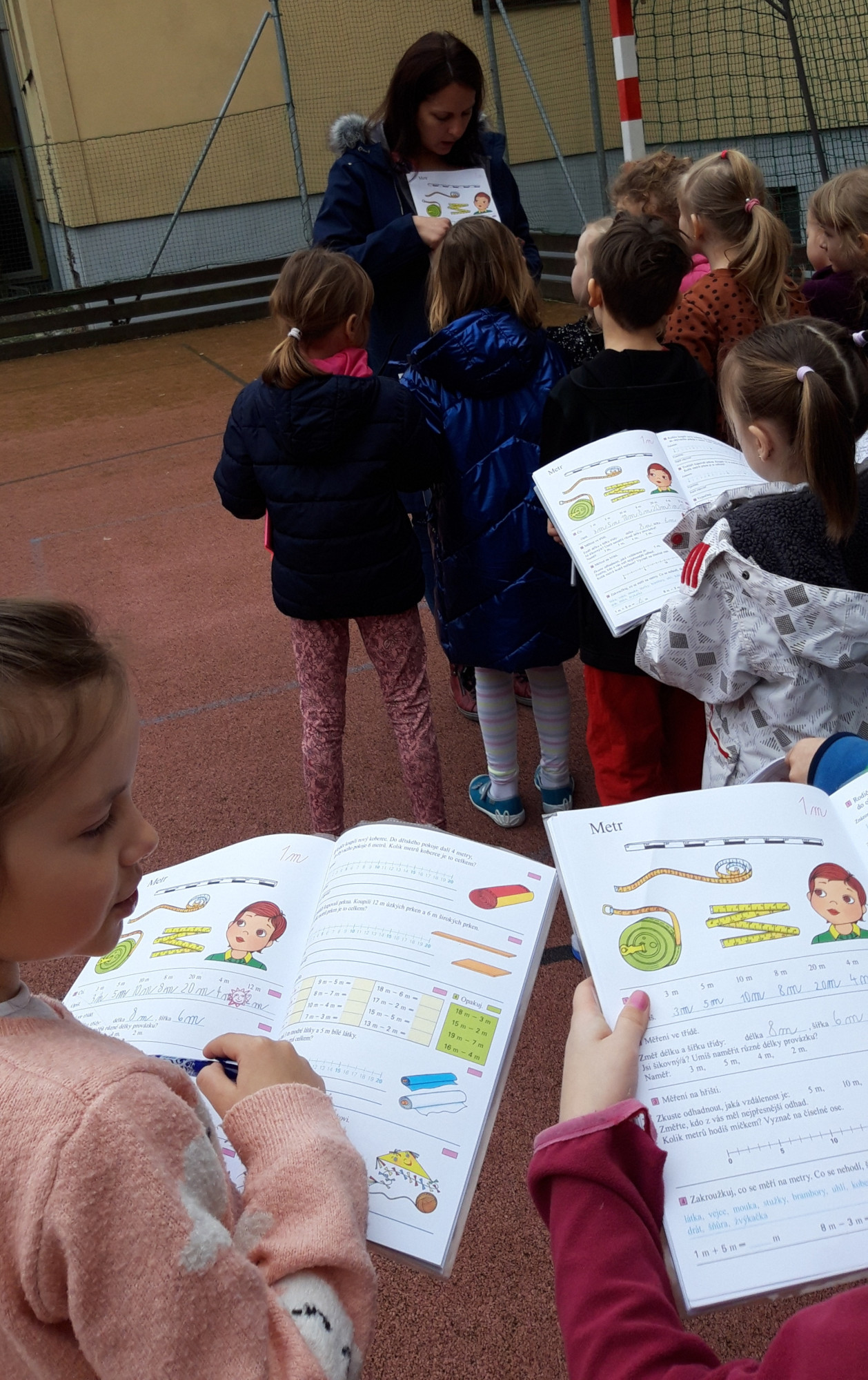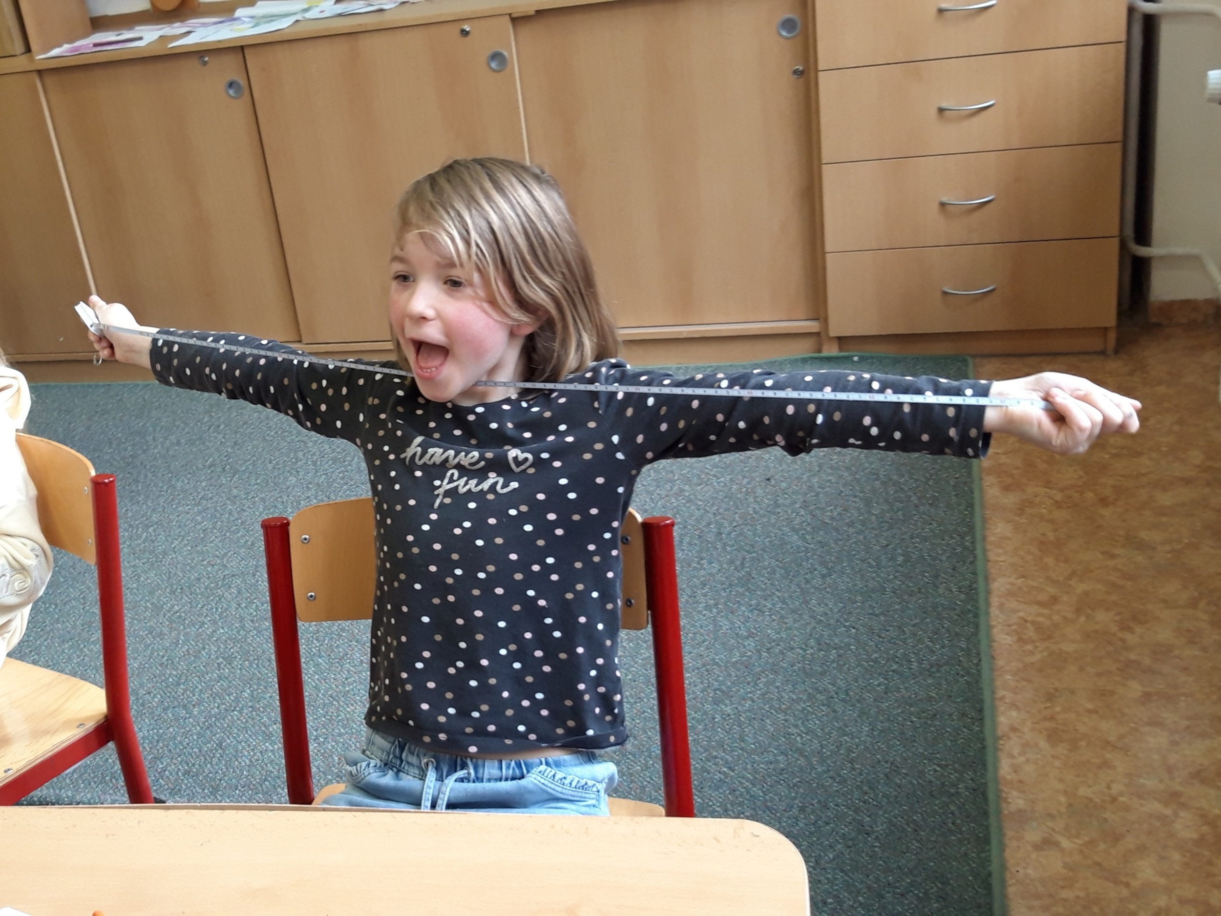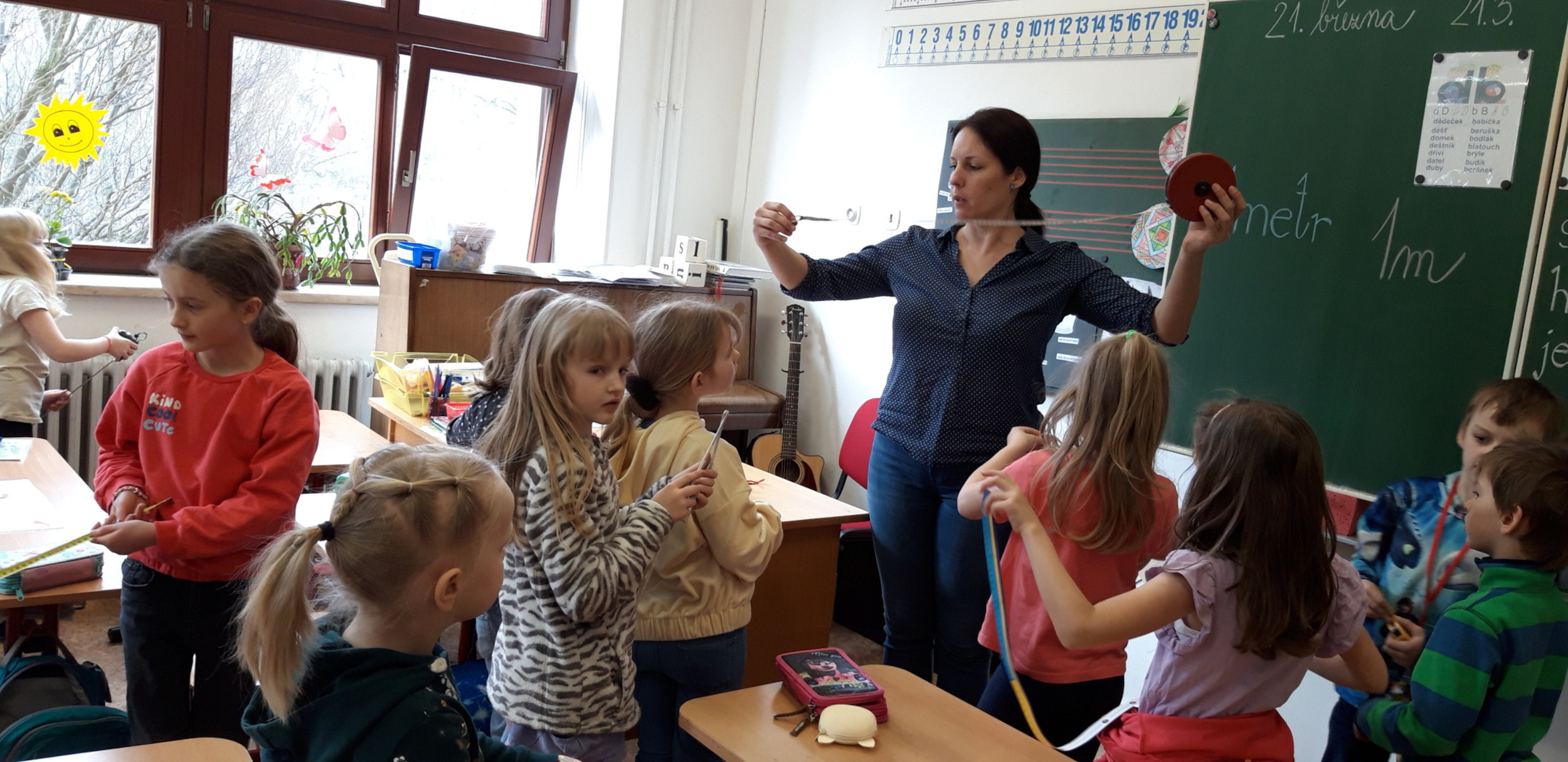 Prvňáčci se v průběhu března seznamovali s délkovou mírou. Měřili různými typy metrů a to jak ve třídě tak ale i venku. Zkusili změřit například: délku třídy, lavice, učebnice, kroku a nebo vlastního hodu kriketovým míčkem.