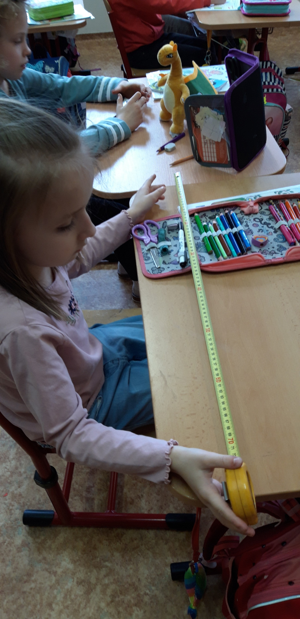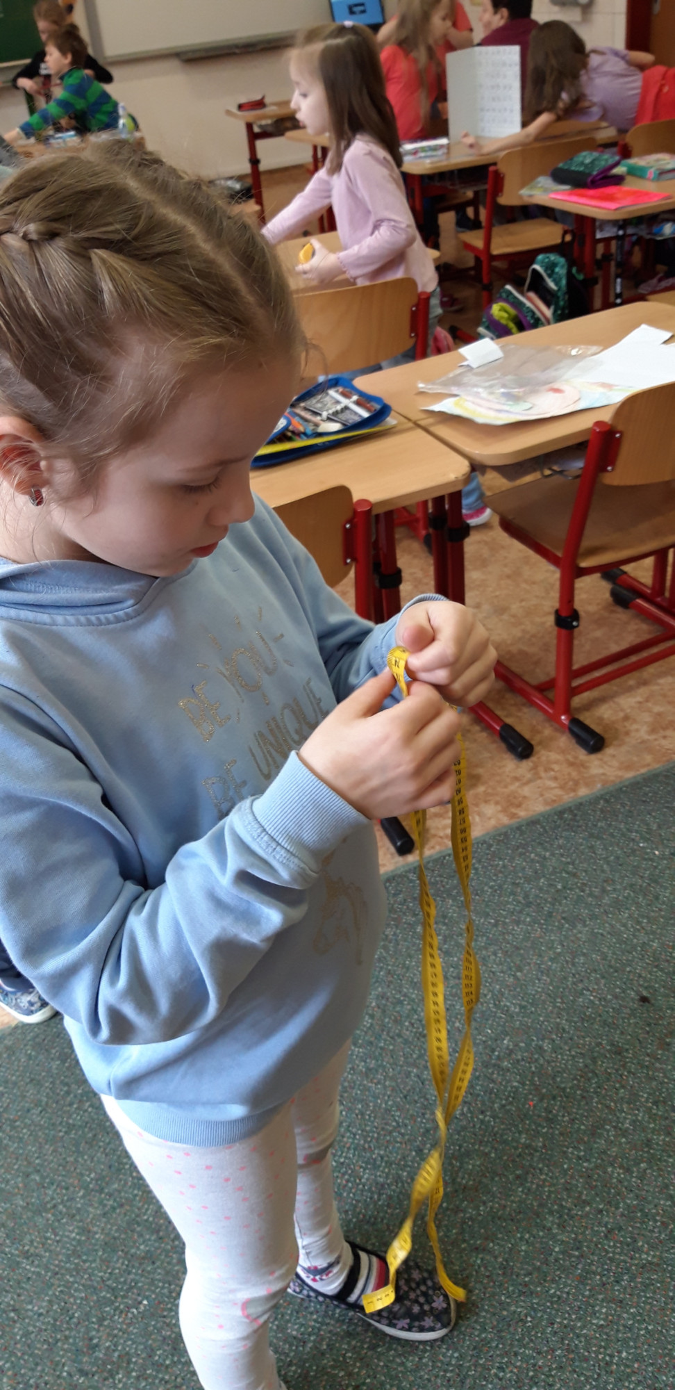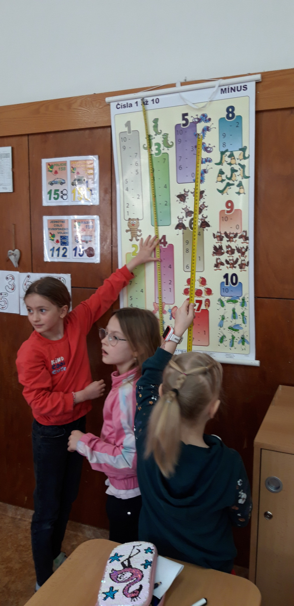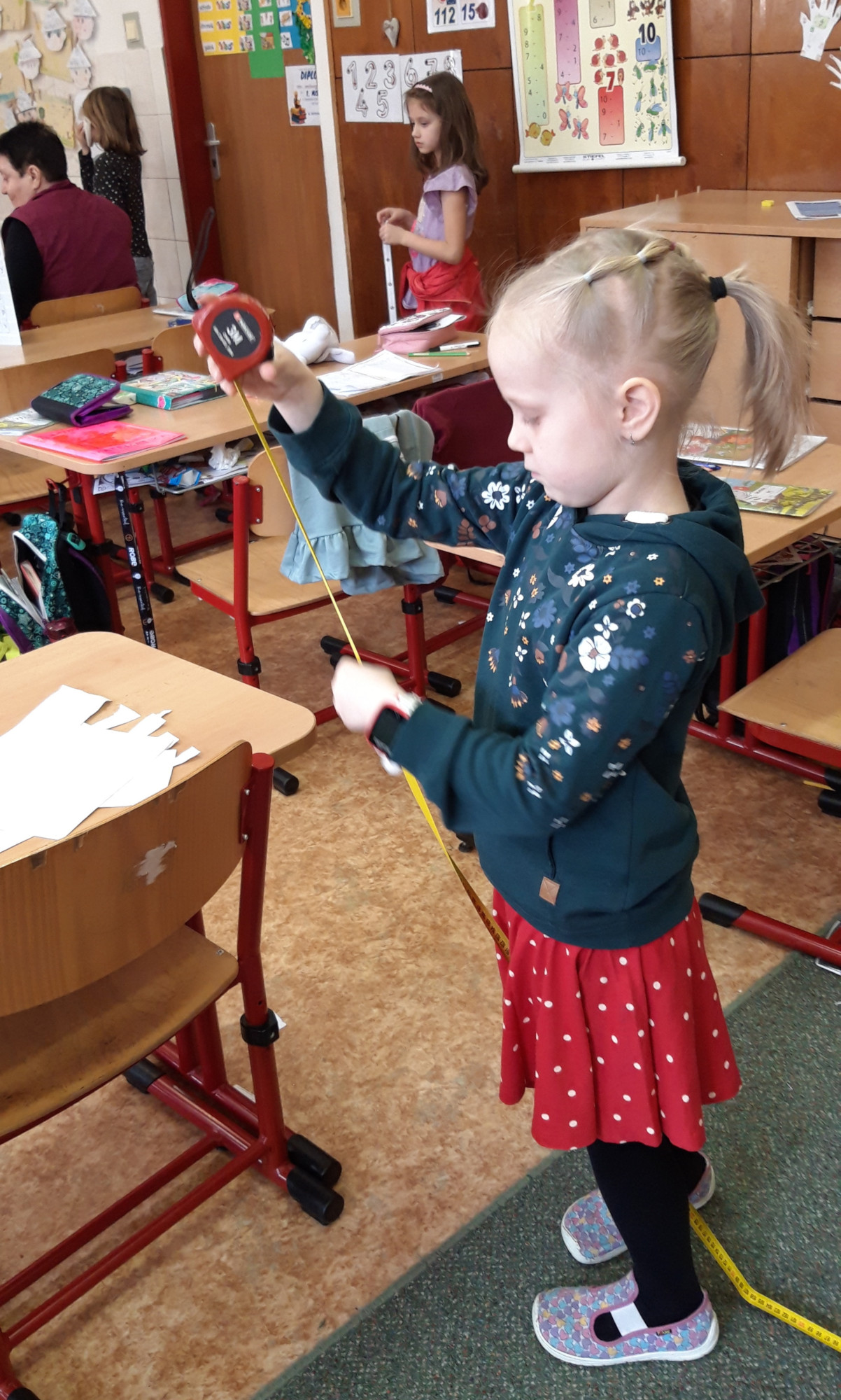 Prvňáčci se v průběhu března seznamovali s délkovou mírou. Měřili různými typy metrů a to jak ve třídě tak ale i venku. Zkusili změřit například: délku třídy, lavice, učebnice, kroku a nebo vlastního hodu kriketovým míčkem.