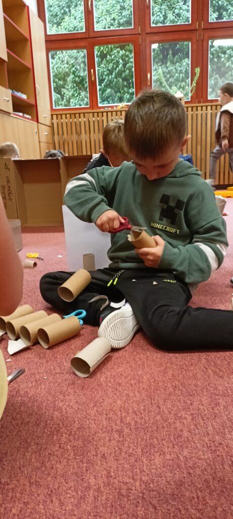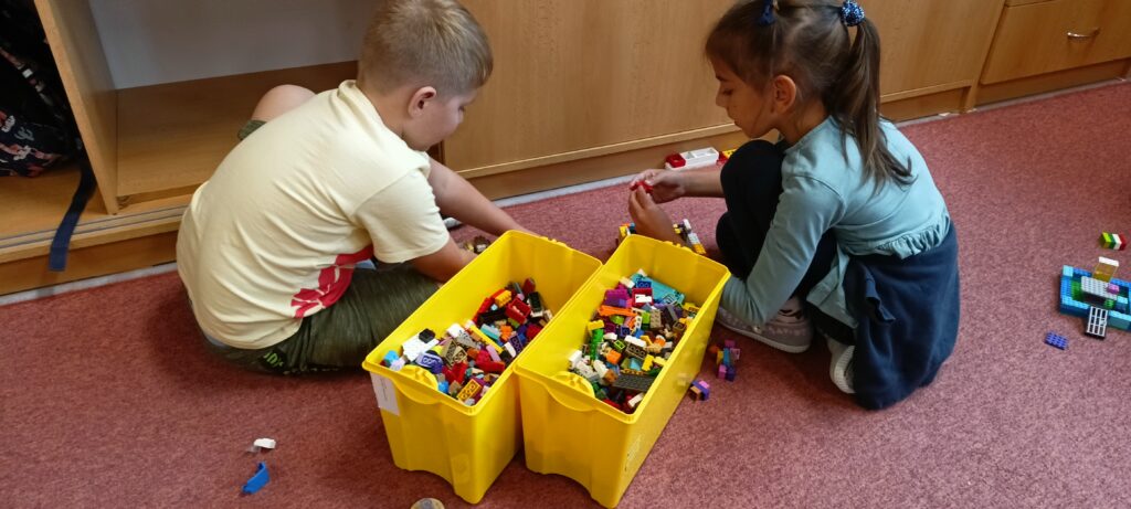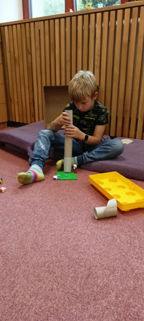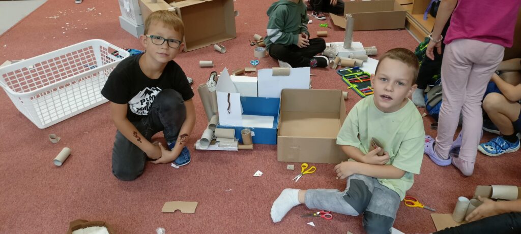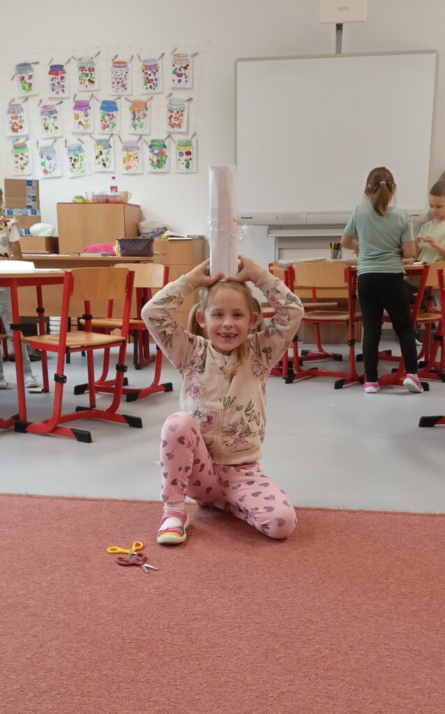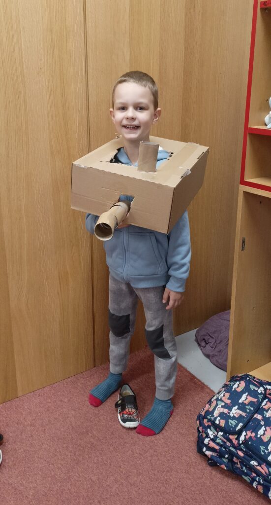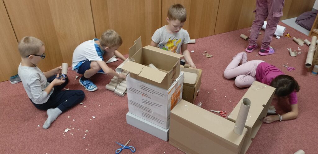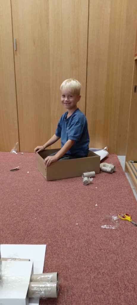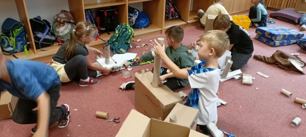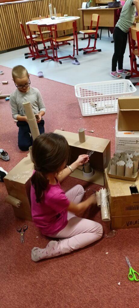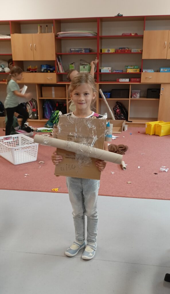 V tomto školním roce podniká družina prvňáčků výlety do různých zemí a do různých časových období. K tomu potřebujeme nějaký přístroj, který nás tam dostane. Všichni žáci se s nadšením pustili do výroby takového stroje, ať už samostatně nebo ve skupinkách. Většina pracovala s kartonem, někteří zvolili za stavební materiál lego. Jejich pracovní nasazení a radost můžete vidět na fotografiích.