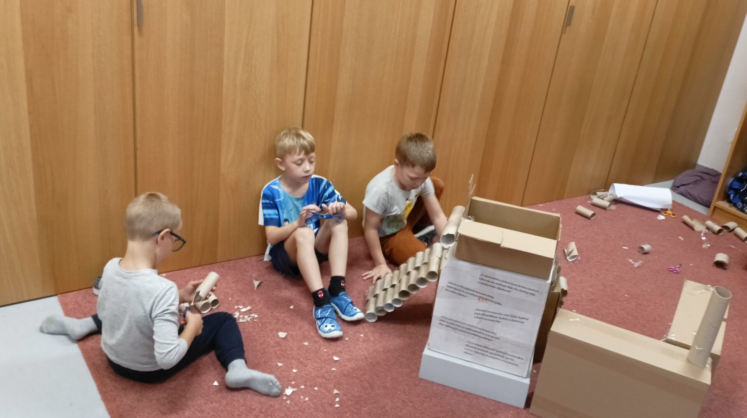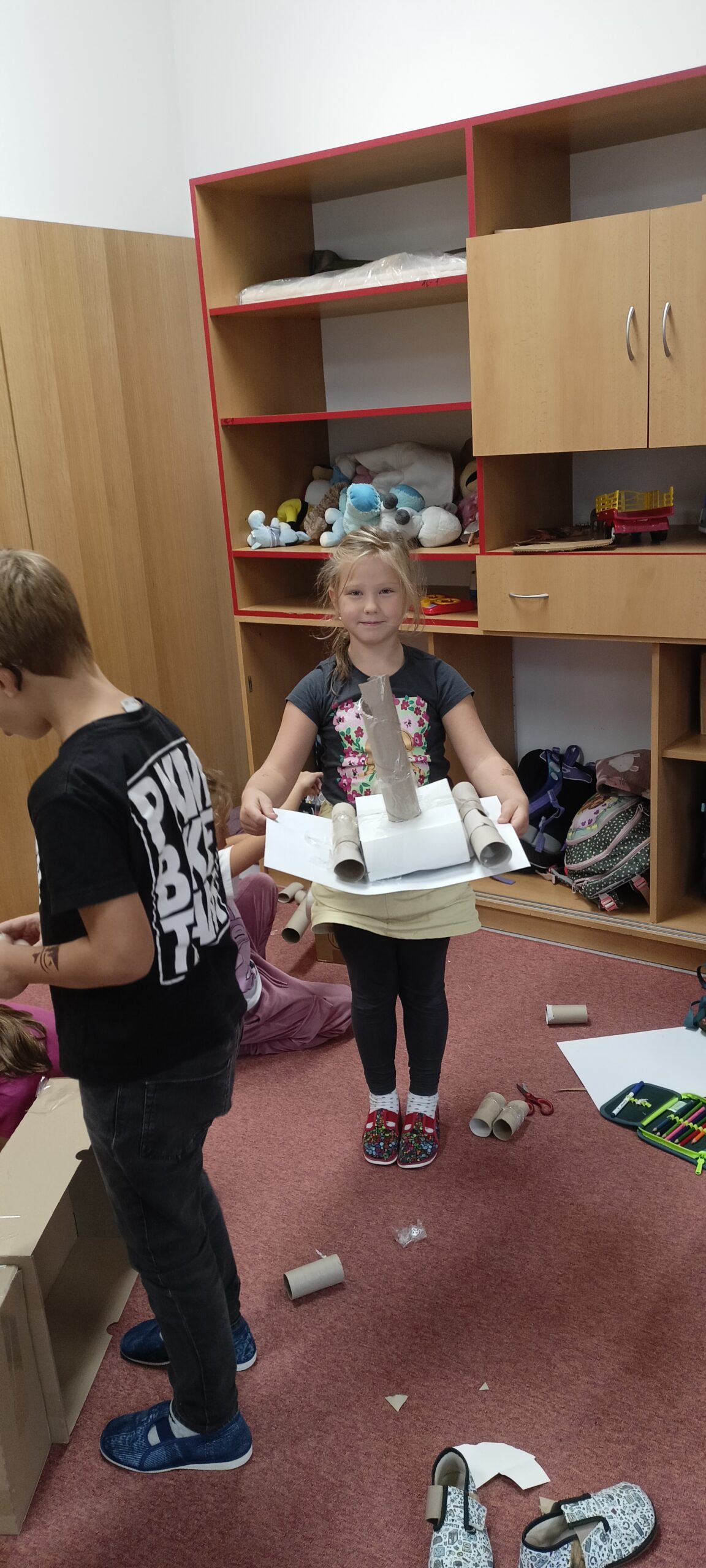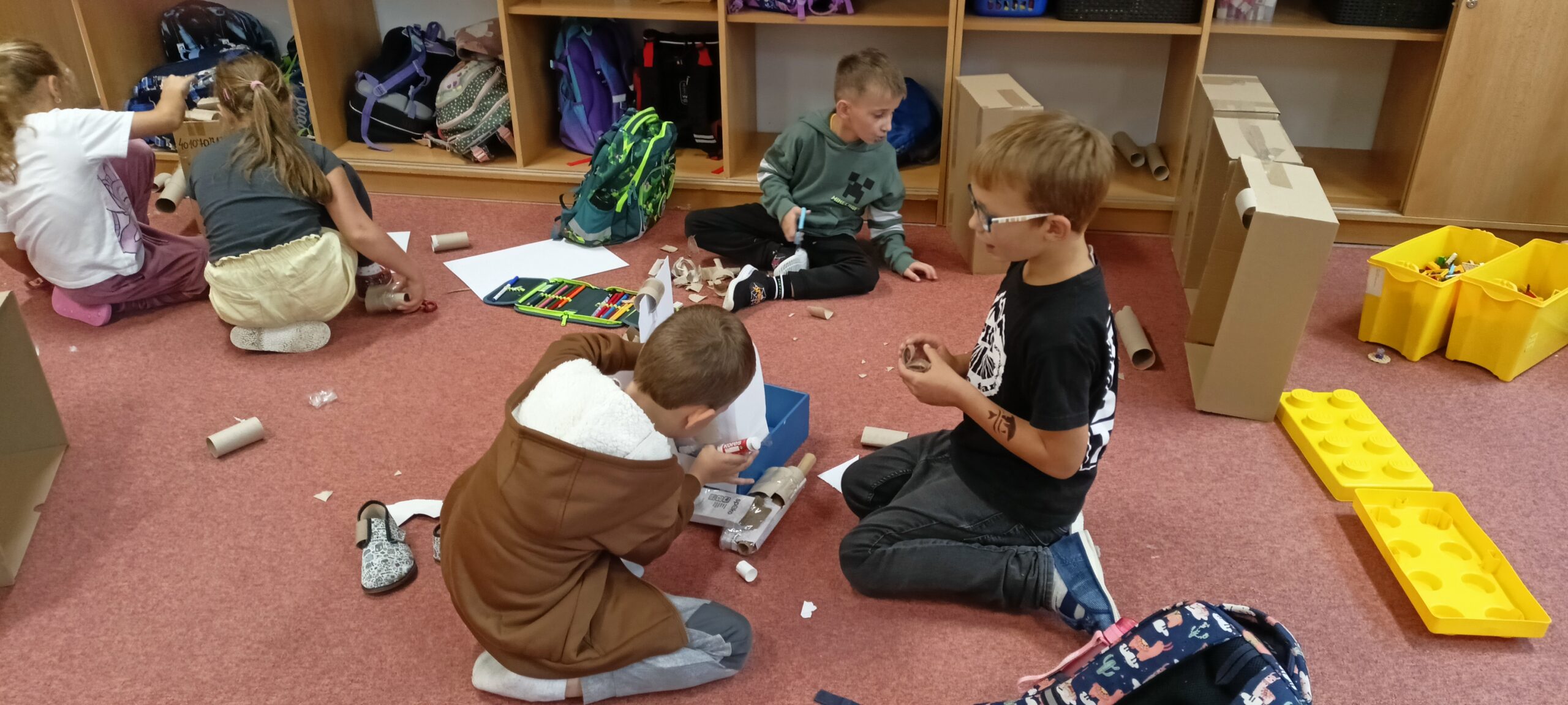 V tomto školním roce podniká družina prvňáčků výlety do různých zemí a do různých časových období. K tomu potřebujeme nějaký přístroj, který nás tam dostane. Všichni žáci se s nadšením pustili do výroby takového stroje, ať už samostatně nebo ve skupinkách. Většina pracovala s kartonem, někteří zvolili za stavební materiál lego. Jejich pracovní nasazení a radost můžete vidět na fotografiích.