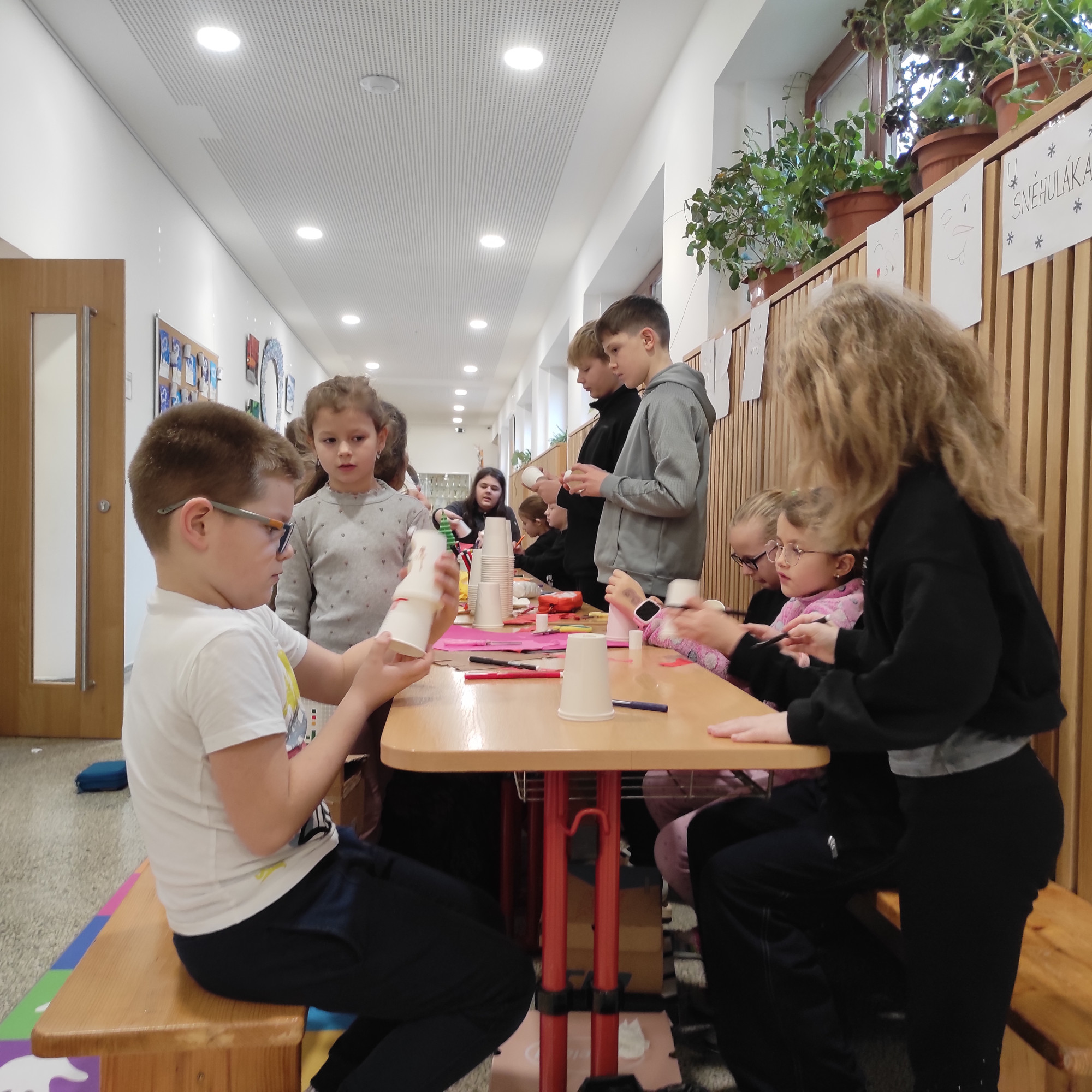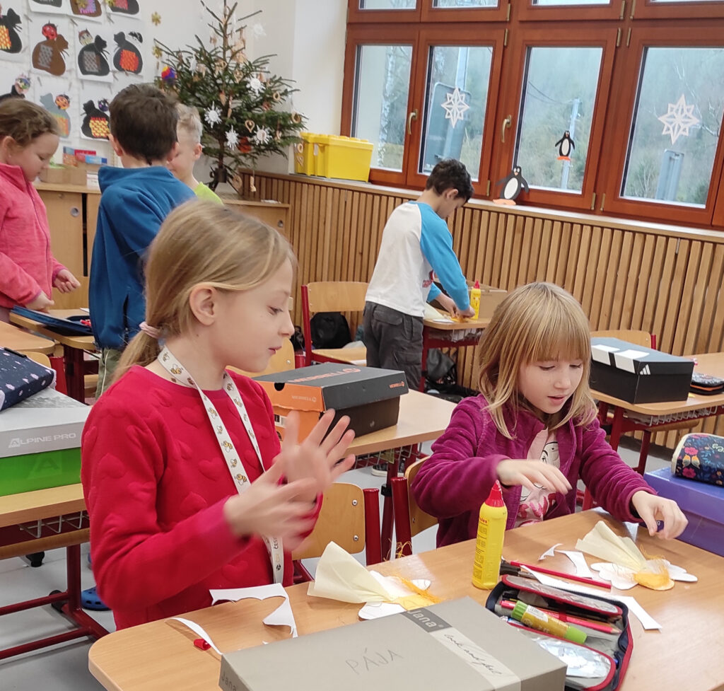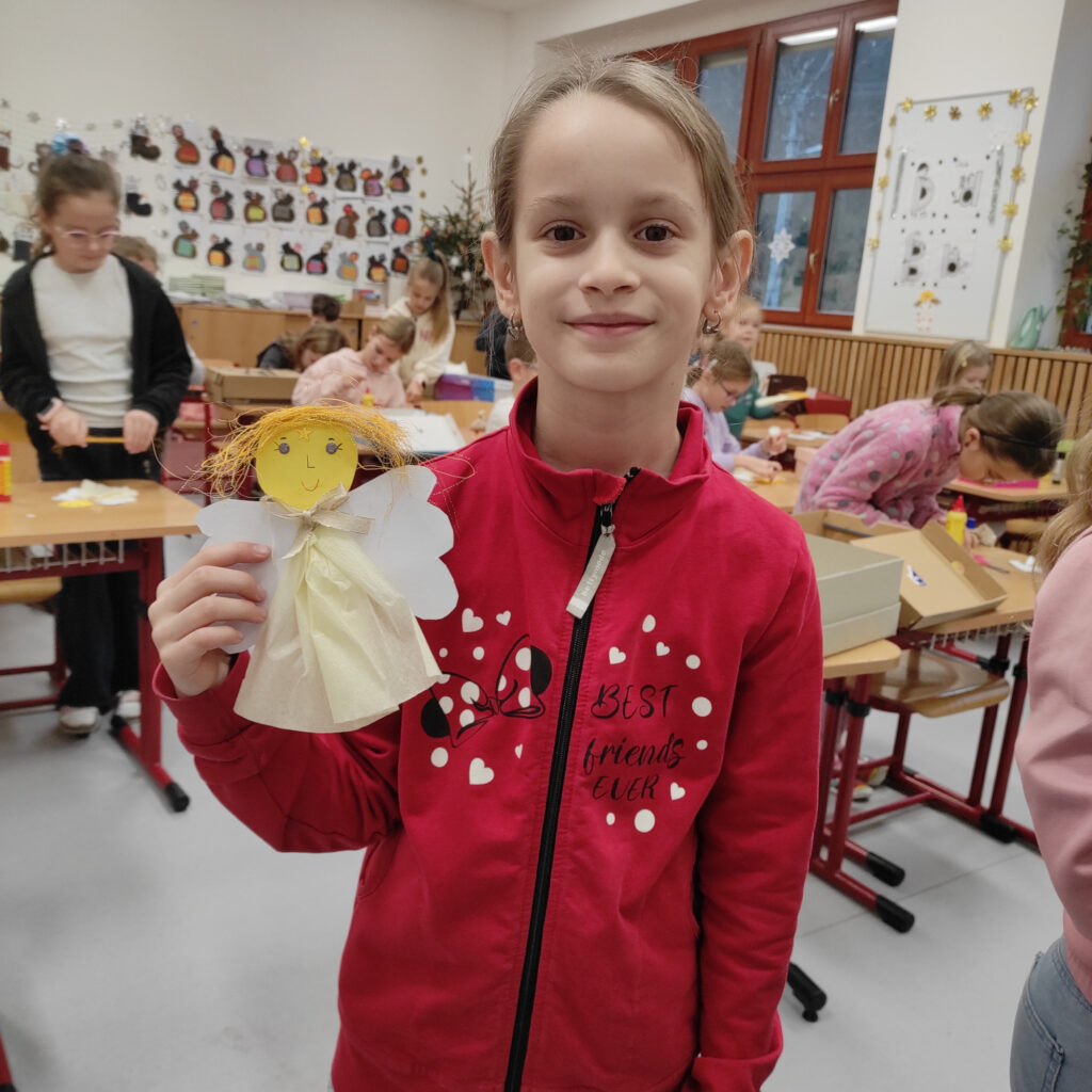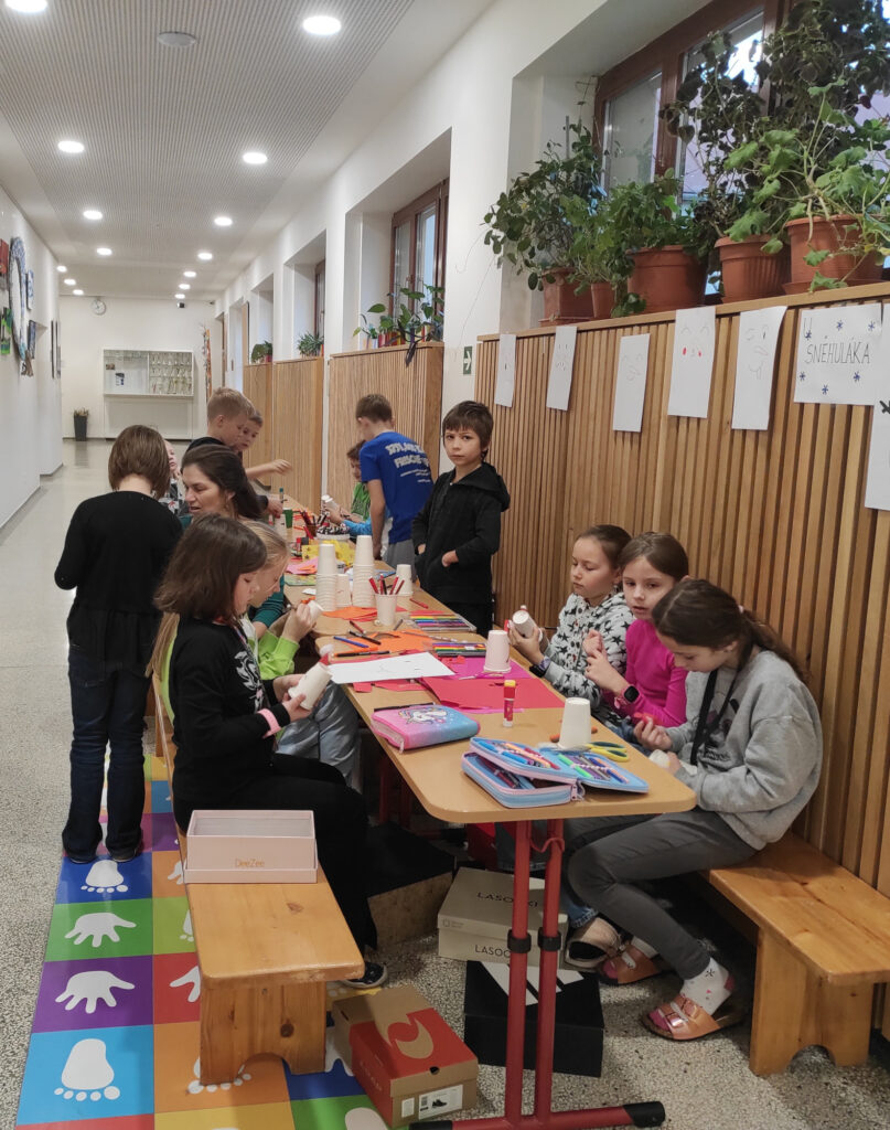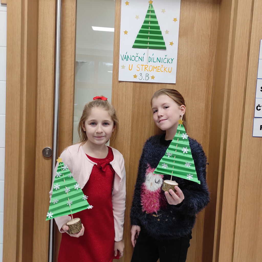 V pátek 12. prosince jsme měli na 1. stupni Vánoční dílničky. V šesti třídách si paní učitelky pro žáky přichystaly nějaký výrobek – vánoční přání, andílka, sněhuláčka, stromeček, sněžítko a ozdoby z kartonu a vlny. V 1. hodině si žáci výrobek udělali ve své kmenové třídě. Pak se po skupinkách i jednotlivě rozešli do ostatních tříd a pustili se do práce na dalších výrobcích. Starší žáci pomáhali těm mladším a někteří z nich si je dokonce vzali pod svá křídla a obcházeli s nimi všechny třídy. A to je bezva. Často se taky stalo, že si žáci jeden výrobek přišli udělat podruhé, dokonce i potřetí. Během čtyř vyučovacích hodin se vše parádně stihlo. Třídy byly uklizené, výrobky hotové, žáci, paní učitelky a asistentky spokojené.