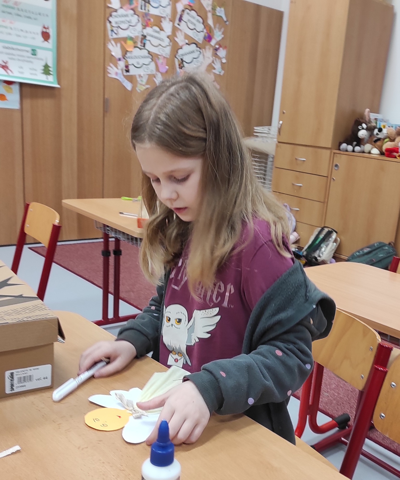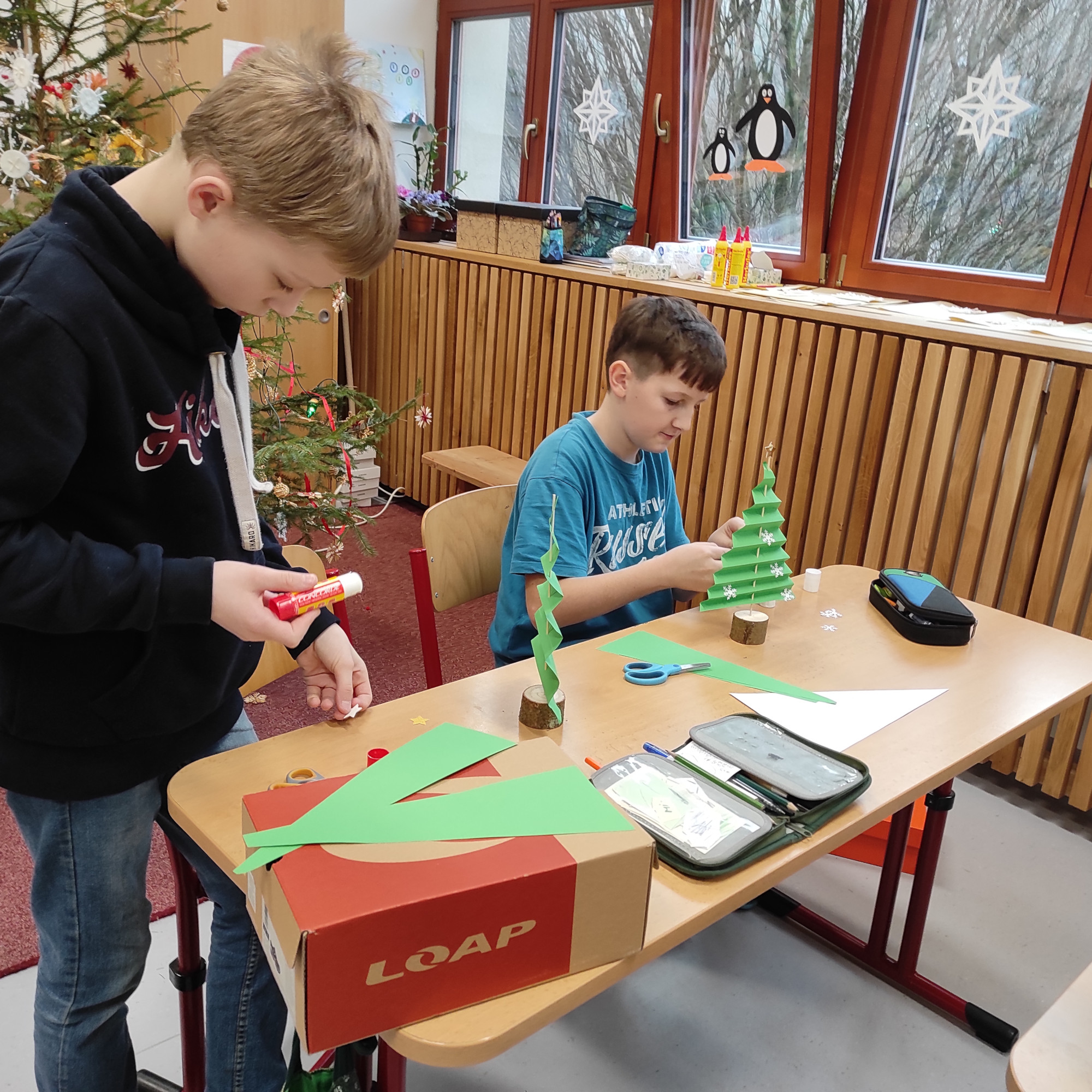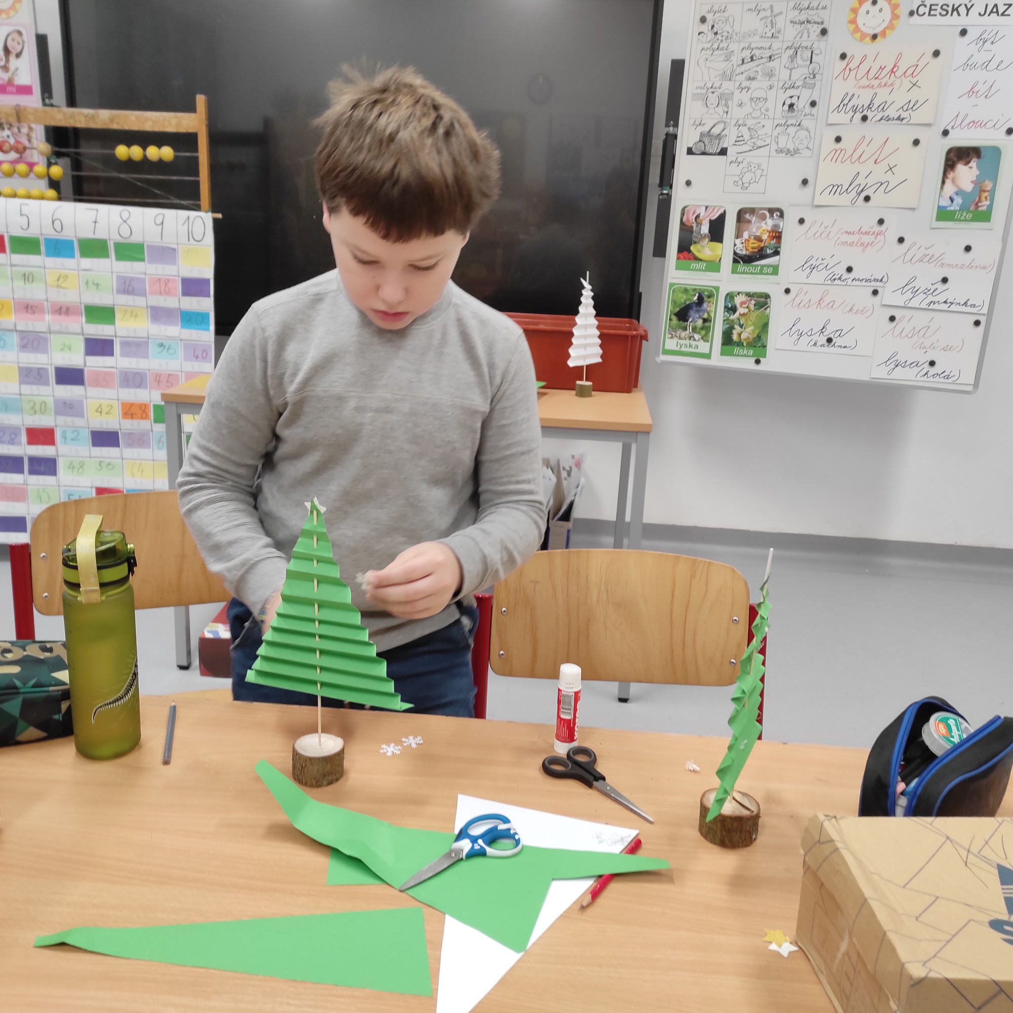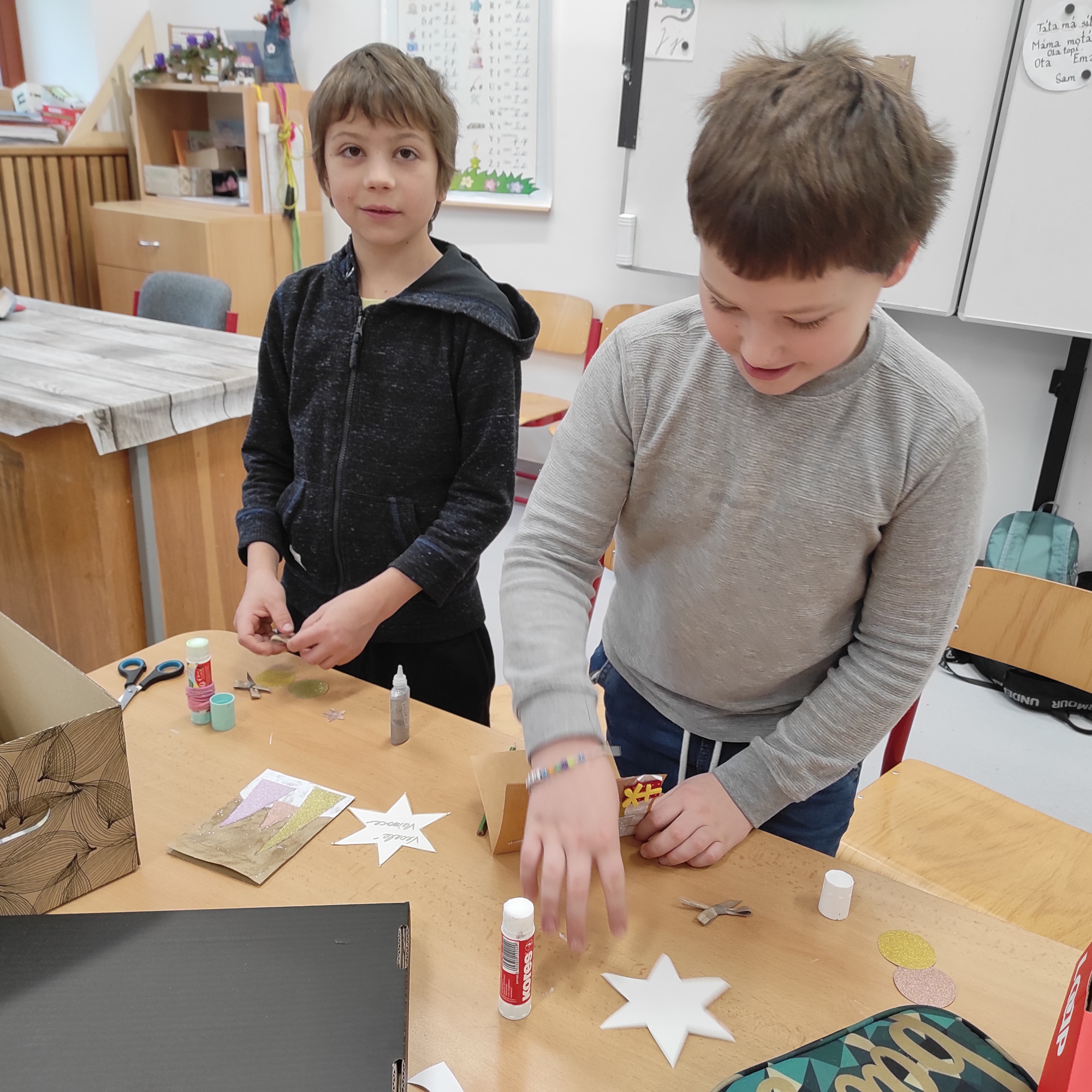V pátek 12. prosince jsme měli na 1. stupni Vánoční dílničky. V šesti třídách si paní učitelky pro žáky přichystaly nějaký výrobek – vánoční přání, andílka, sněhuláčka, stromeček, sněžítko a ozdoby z kartonu a vlny. V 1. hodině si žáci výrobek udělali ve své kmenové třídě. Pak se po skupinkách i jednotlivě rozešli do ostatních tříd a pustili se do práce na dalších výrobcích. Starší žáci pomáhali těm mladším a někteří z nich si je dokonce vzali pod svá křídla a obcházeli s nimi všechny třídy. A to je bezva. Často se taky stalo, že si žáci jeden výrobek přišli udělat podruhé, dokonce i potřetí. Během čtyř vyučovacích hodin se vše parádně stihlo. Třídy byly uklizené, výrobky hotové, žáci, paní učitelky a asistentky spokojené.