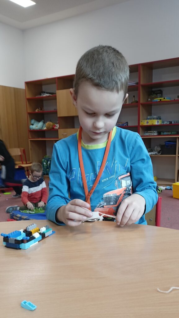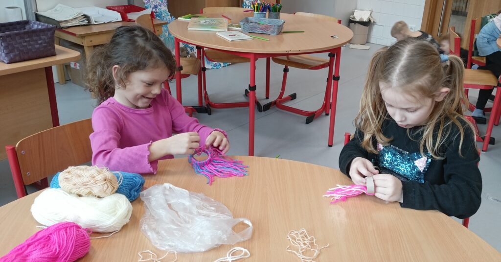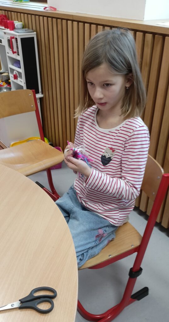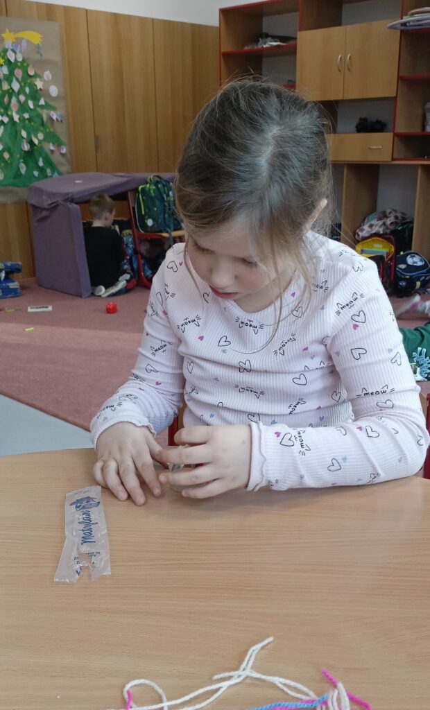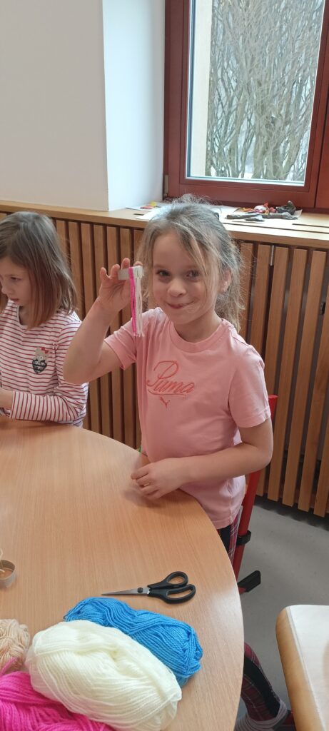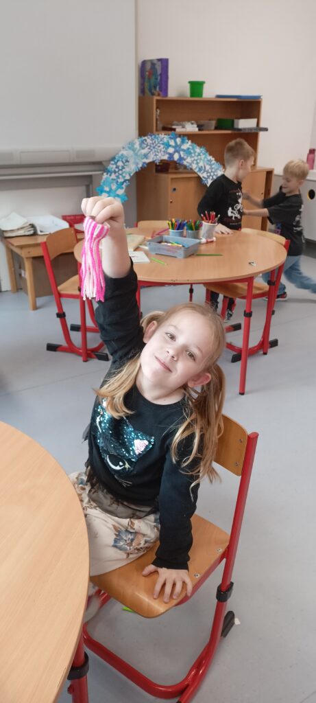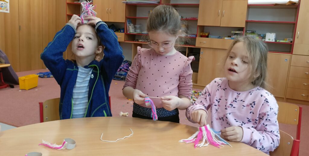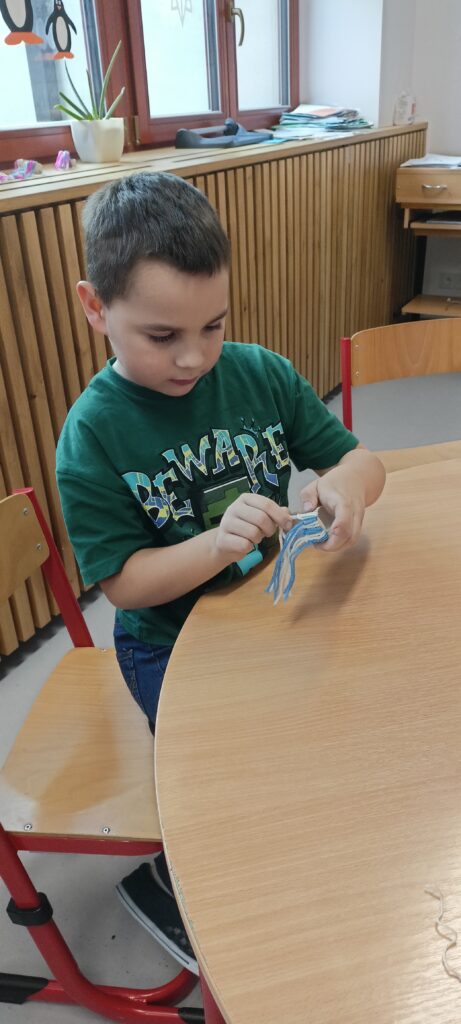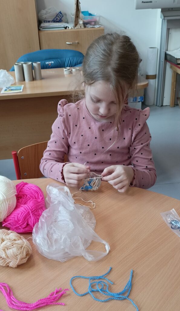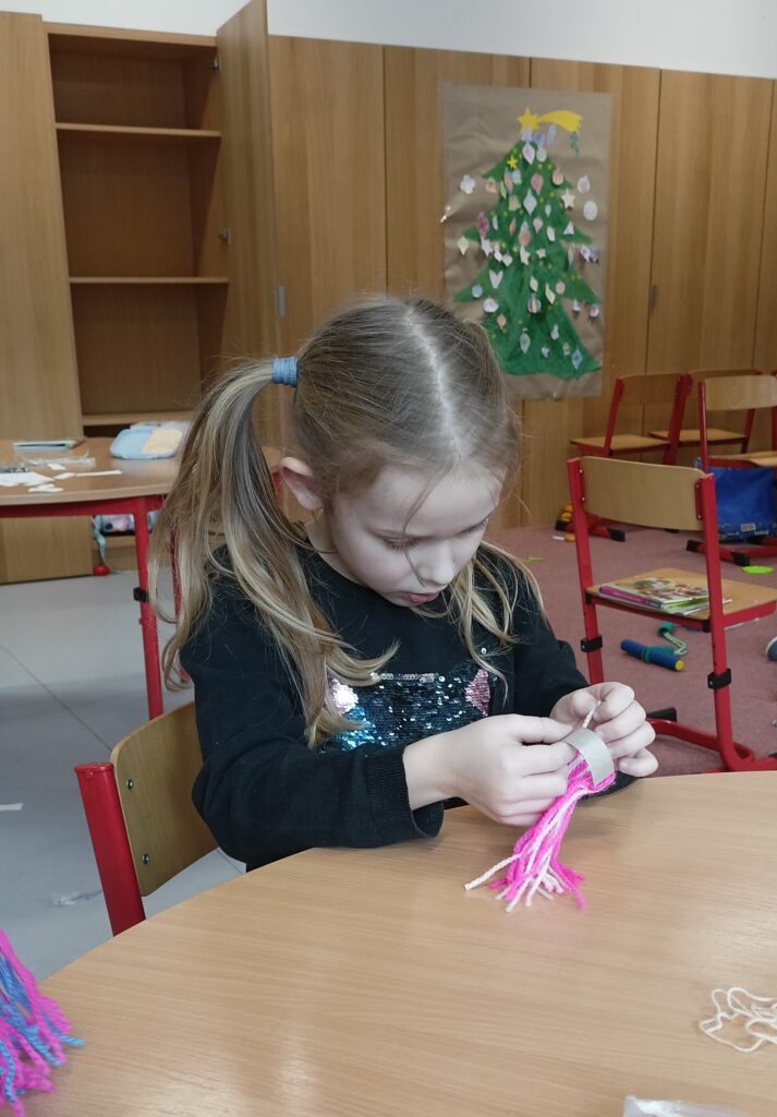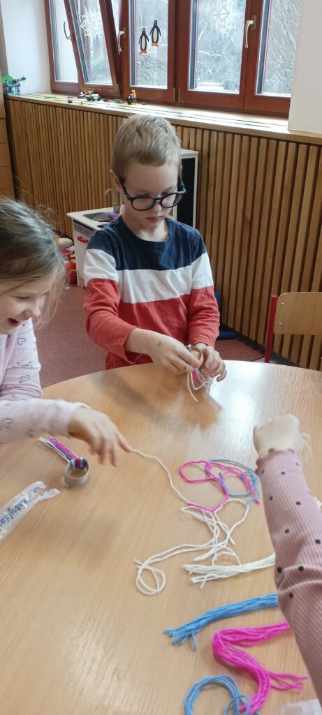 Během Vánoc krásně nasněžilo, a i když jsou prvňáci velcí otužilci, teplá pletená čepice je nepostradatelnou výbavou na cestu do školy. Proto si ji žáci v družině zkusili vyrobit navazováním proužků vlny na kruh z ruličky od toaletního papíru. Potrénovali tak zručnost, dodržení zvolených barevných kombinací a zejména trpělivost. Těch proužků bylo potřeba navázat opravdu hodně.