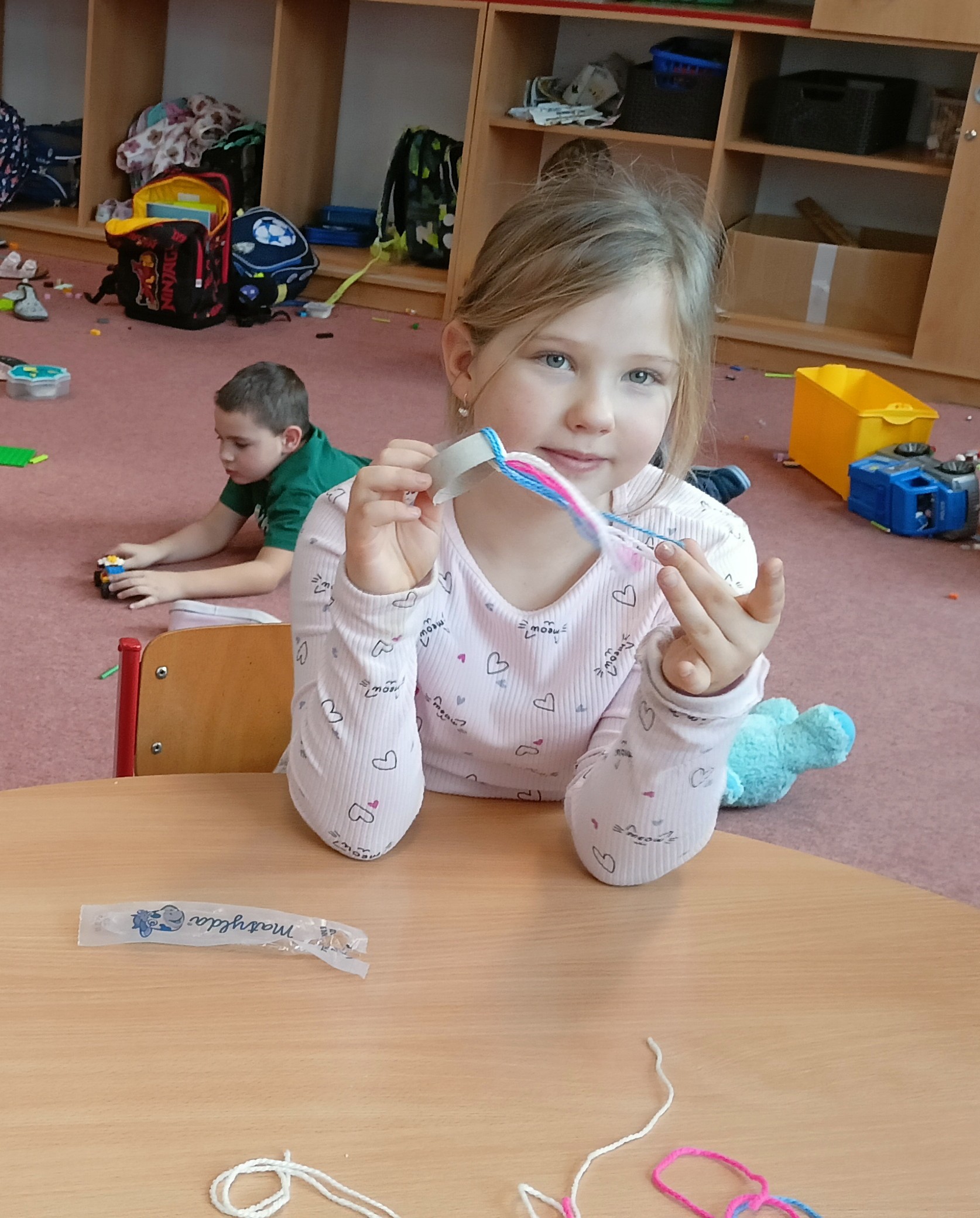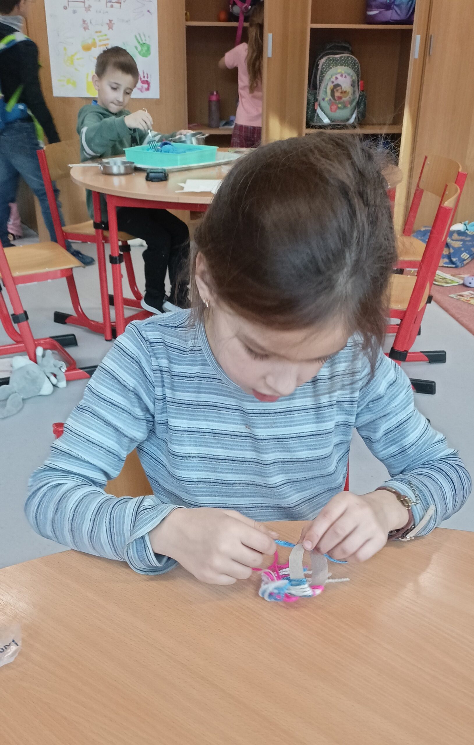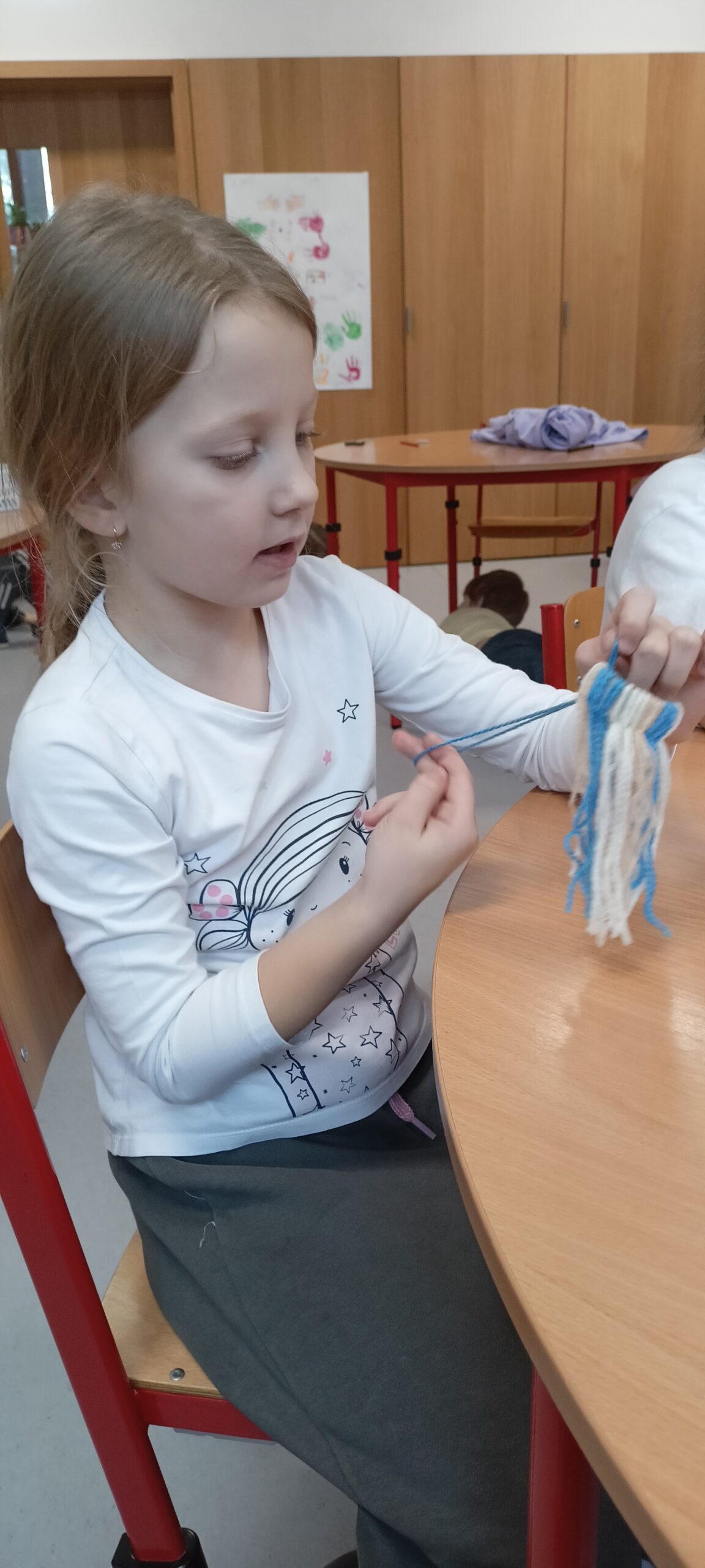 Během Vánoc krásně nasněžilo, a i když jsou prvňáci velcí otužilci, teplá pletená čepice je nepostradatelnou výbavou na cestu do školy. Proto si ji žáci v družině zkusili vyrobit navazováním proužků vlny na kruh z ruličky od toaletního papíru. Potrénovali tak zručnost, dodržení zvolených barevných kombinací a zejména trpělivost. Těch proužků bylo potřeba navázat opravdu hodně.