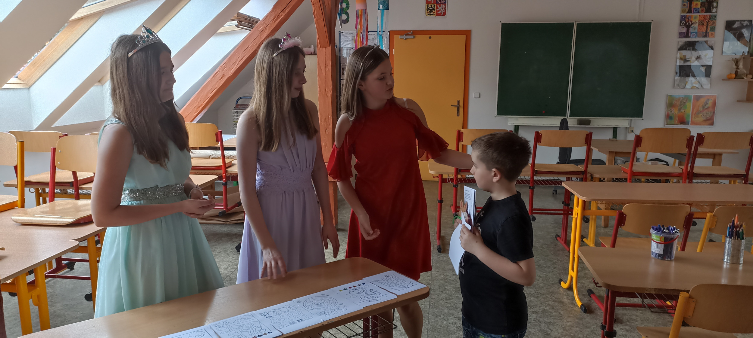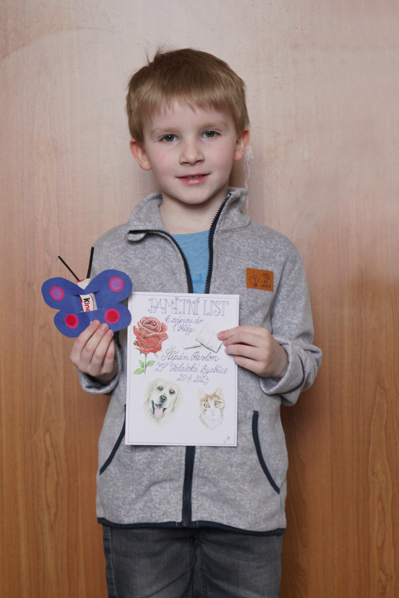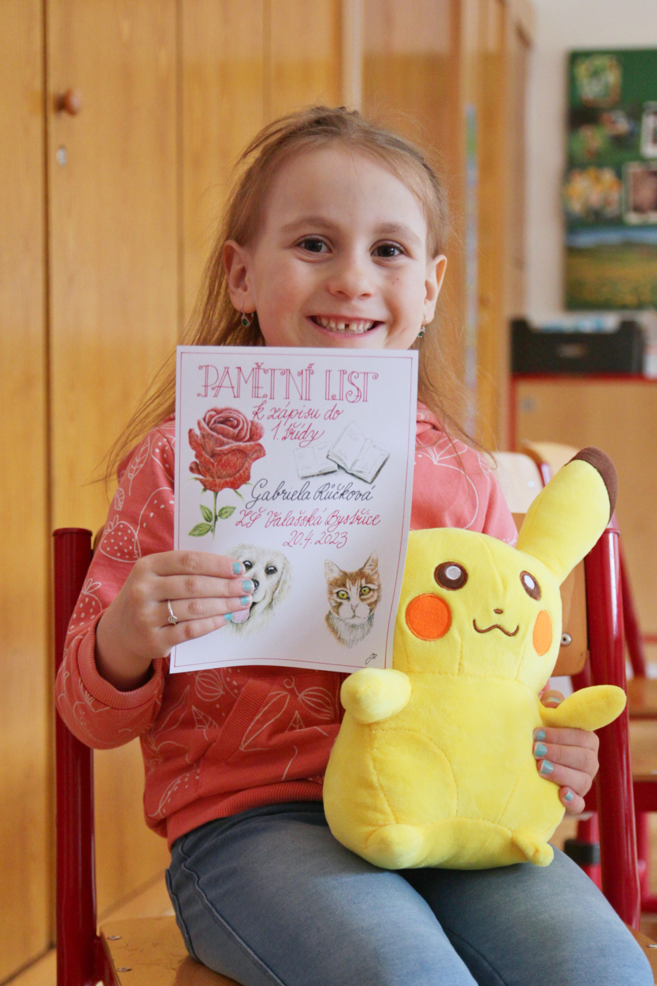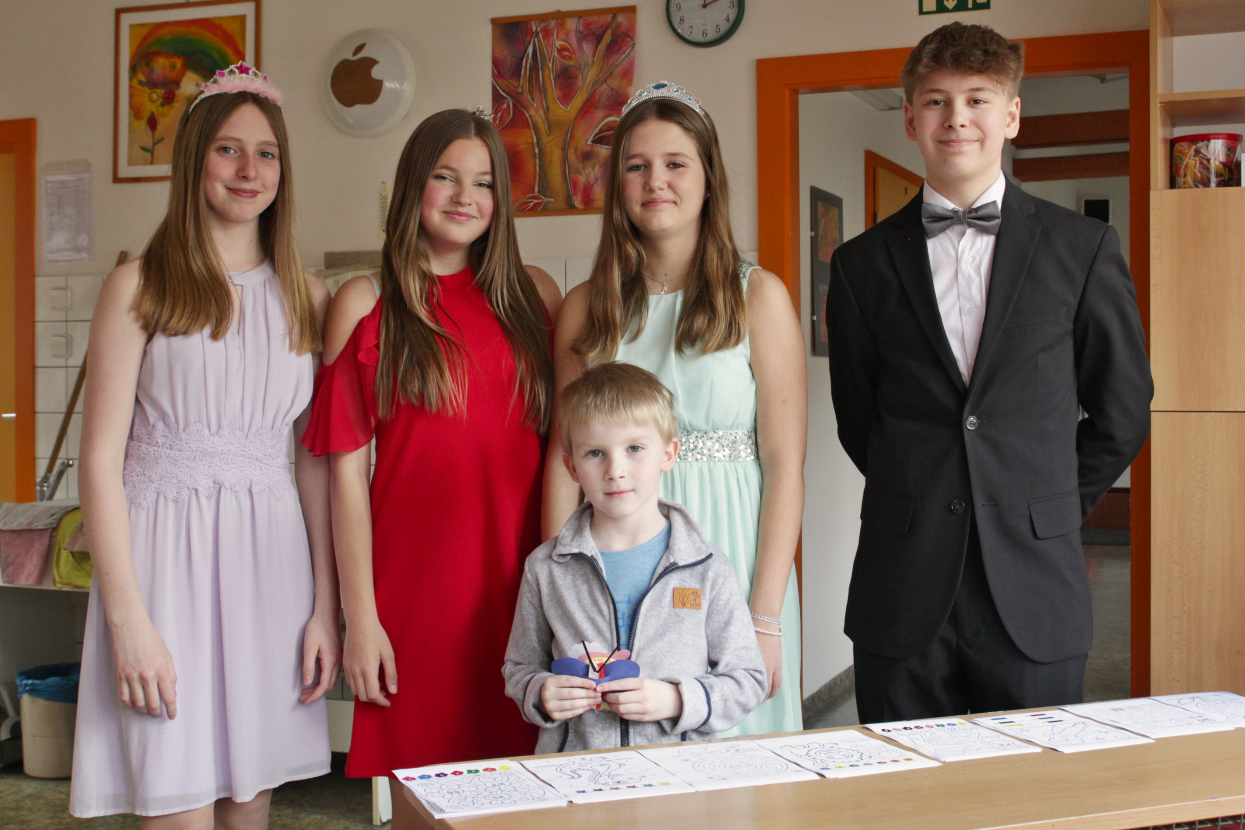 Ve čtvrtek 20. dubna od půl 2 odpoledne bylo ve škole živo. Probíhal totiž zápis žáků do první třídy, kterého se zúčastnilo 28 budoucích prvňáčků s rodiči. Aby dojem z nového prostředí byl co nejpříjemnější, žáci 8. třídy po zápise provedli děti po škole. Ukázali jim učebnu přírodopisu, kde si děti mohly pohladit morče nebo si prohlédnout hady, ryby a oblovky, v učebně chemie si děti vyzkoušely jednoduchý pokus a v ateliéru si mohly vybarvit obrázek. Za to vše si pak domu odnášely sladkou odměnu a ručně nakreslený pamětní list, který navrhla naše šikovná osmačka Jennifer Pomklova.