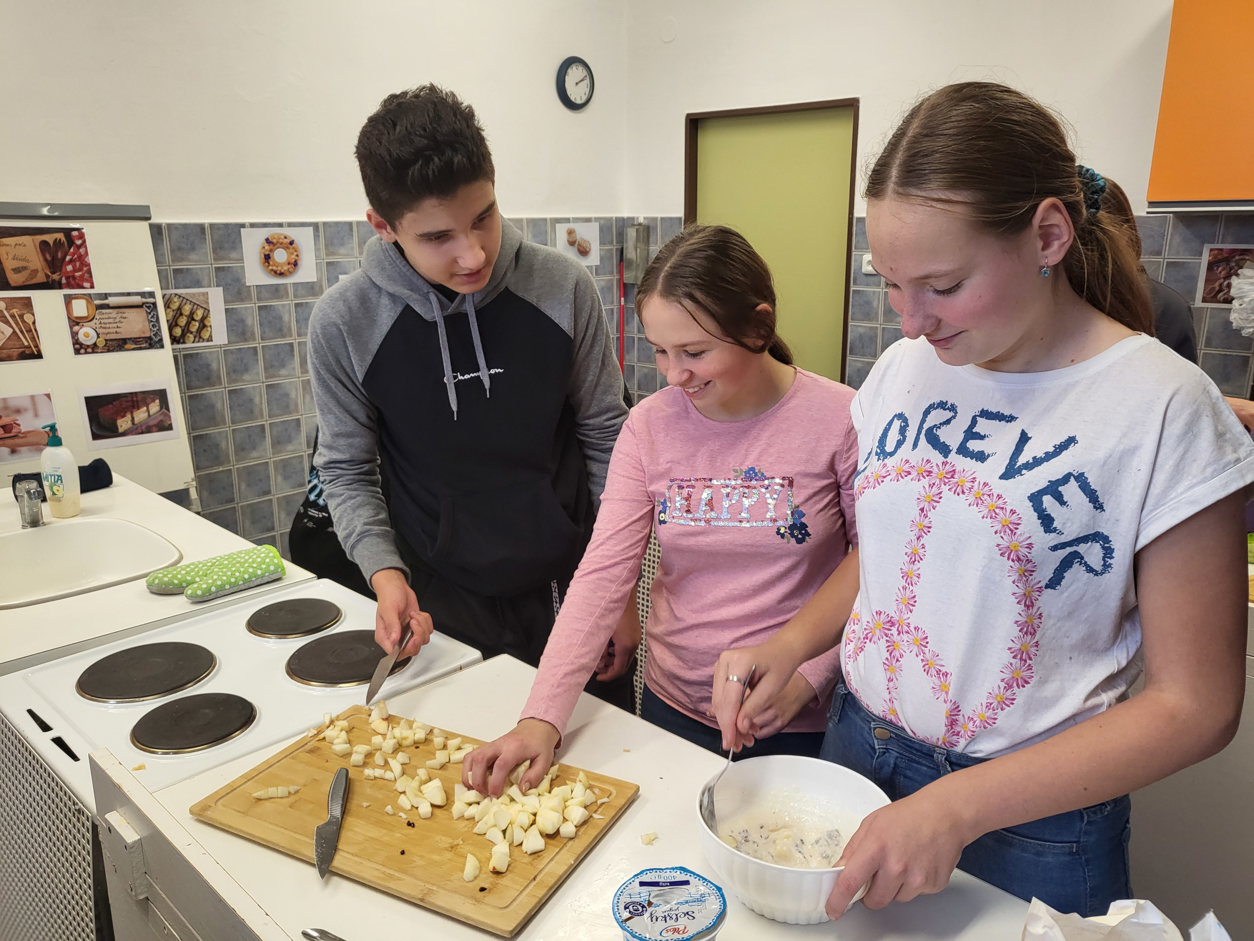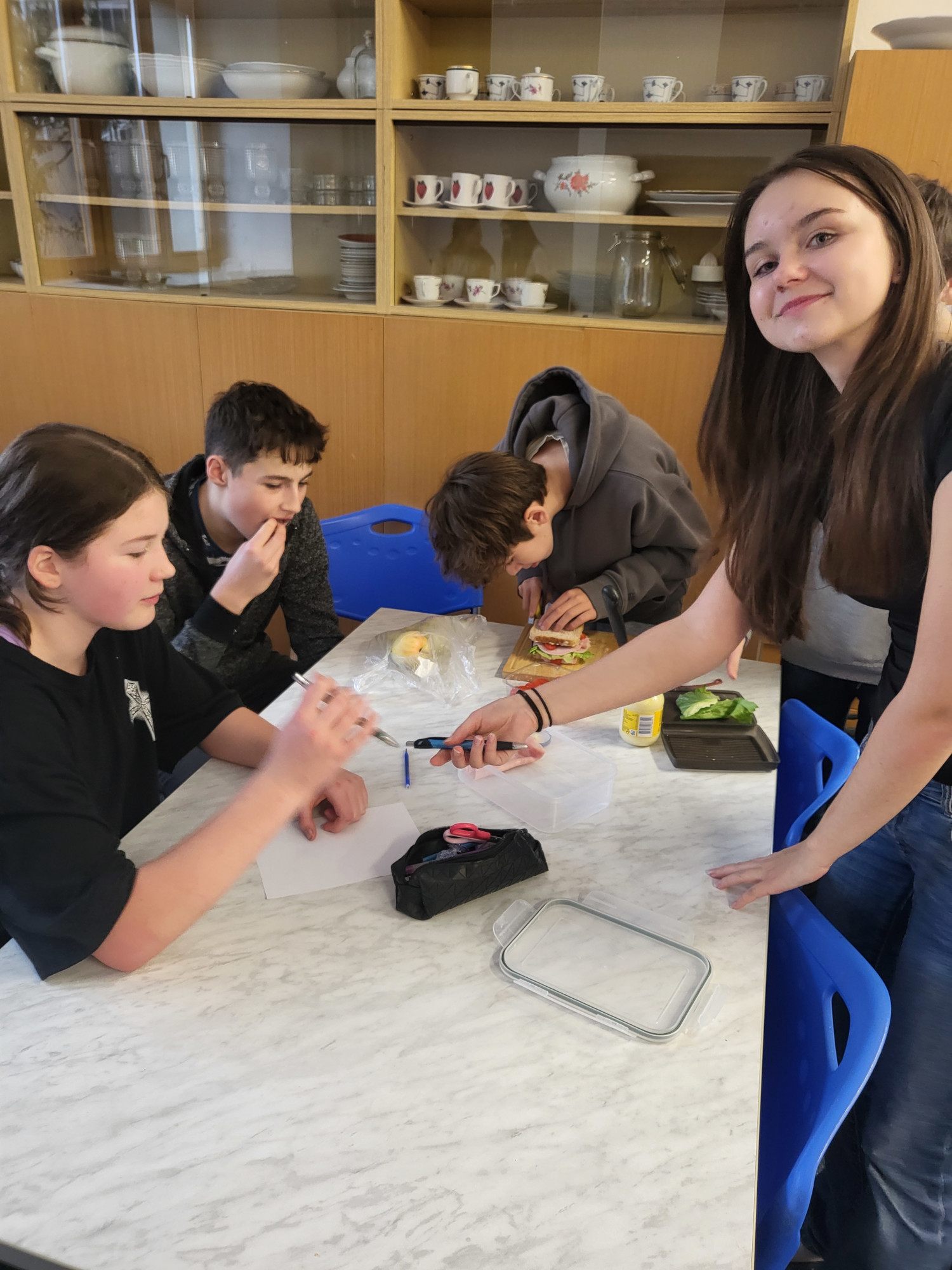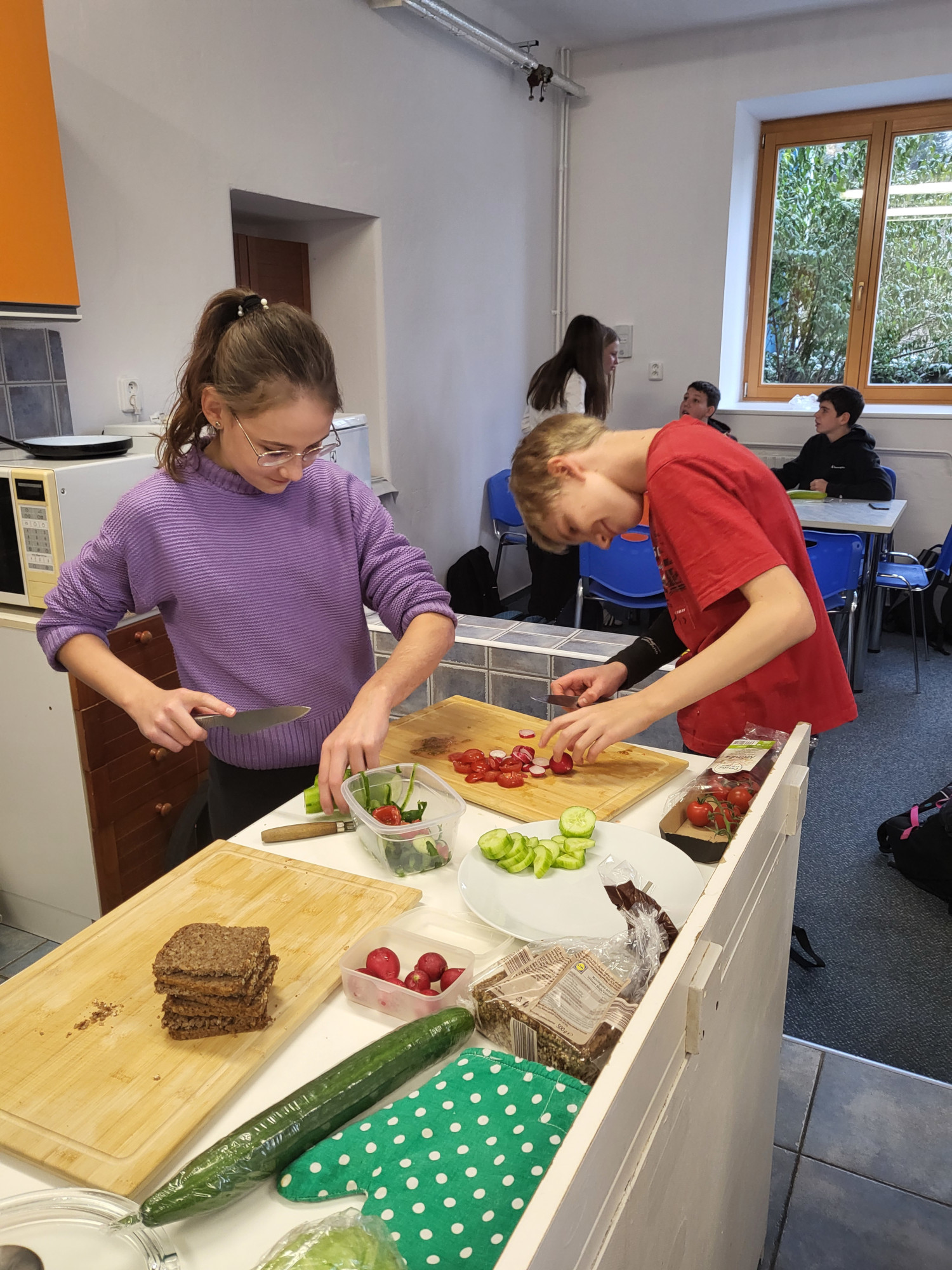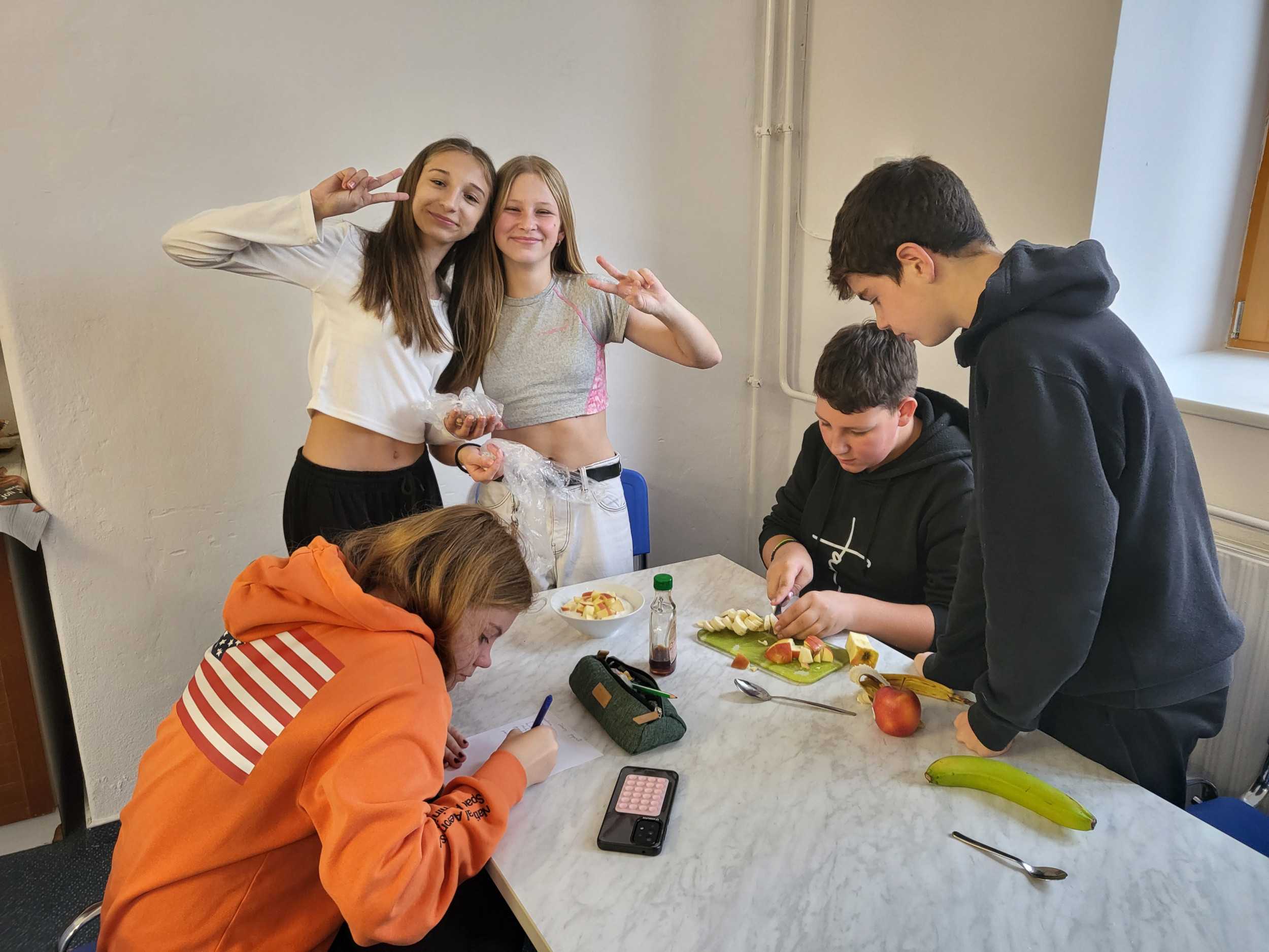 Zadání znělo jasně – každá skupina vymyslí zdravou svačinu pro žáka tak, aby splňovala zásady zdravého stravování. A tak se ve středu odpoledne v kuchyňkách vytvořila skvělá jídla: ovesné kaše s ovocem, šunkový toast se zeleninou, vaječná pomazánka na žitném chlebu nebo třeba bílý jogurt s ovocem a javorovým sirupem…
