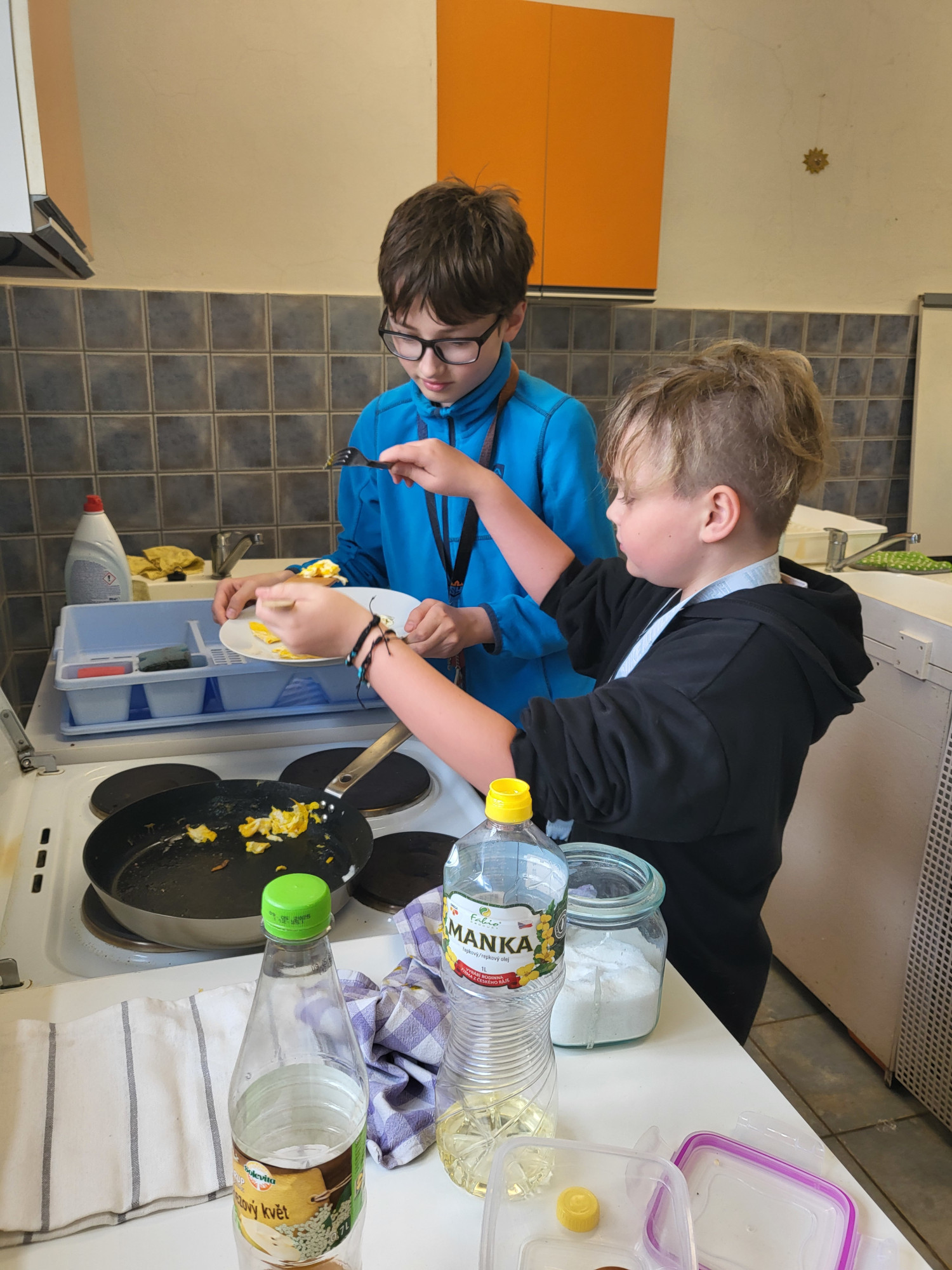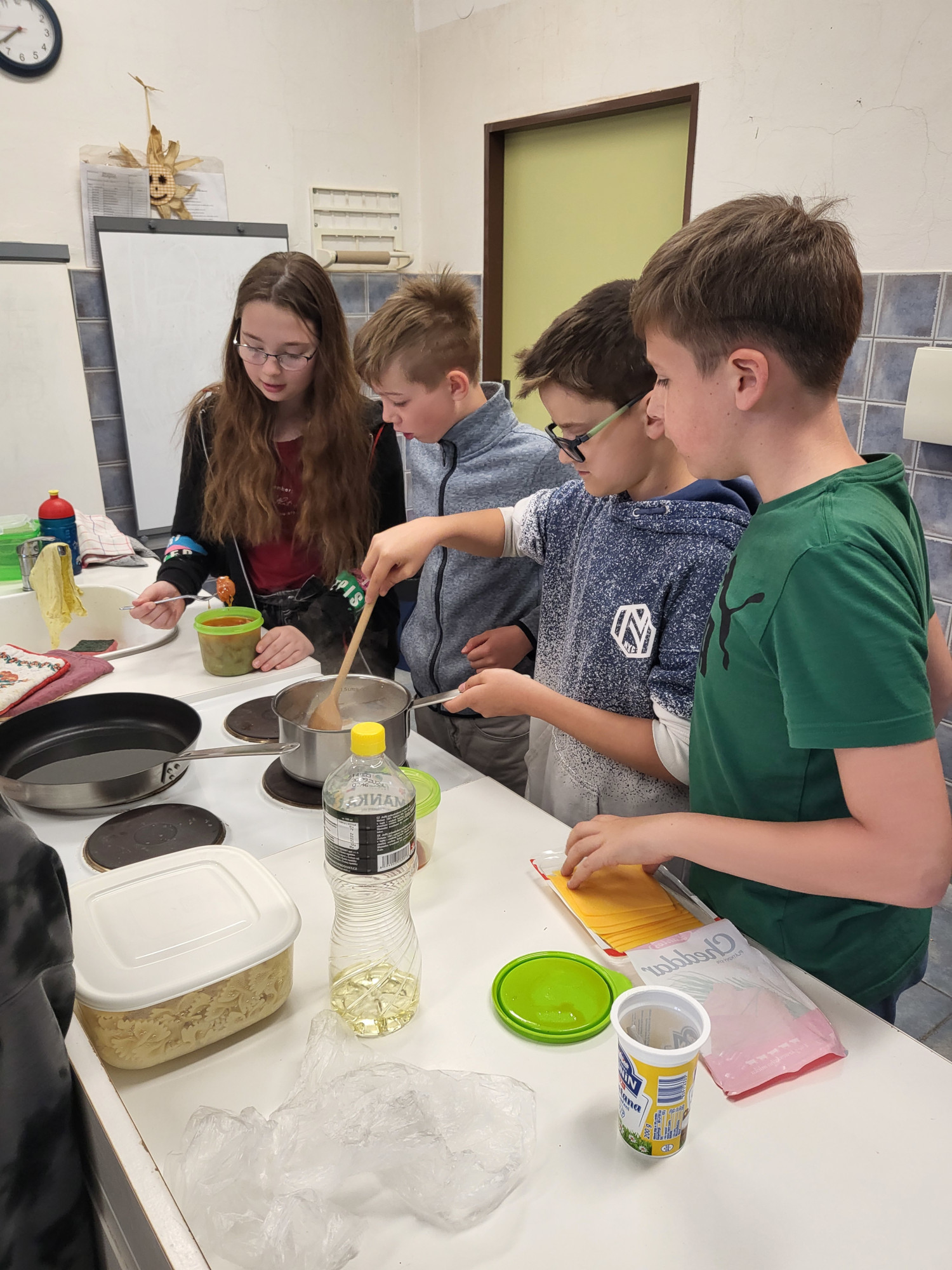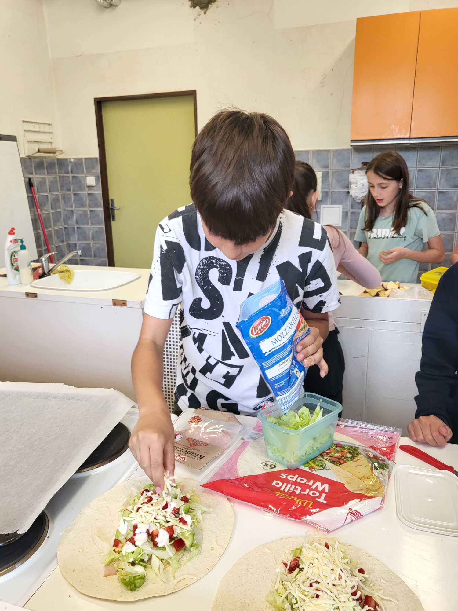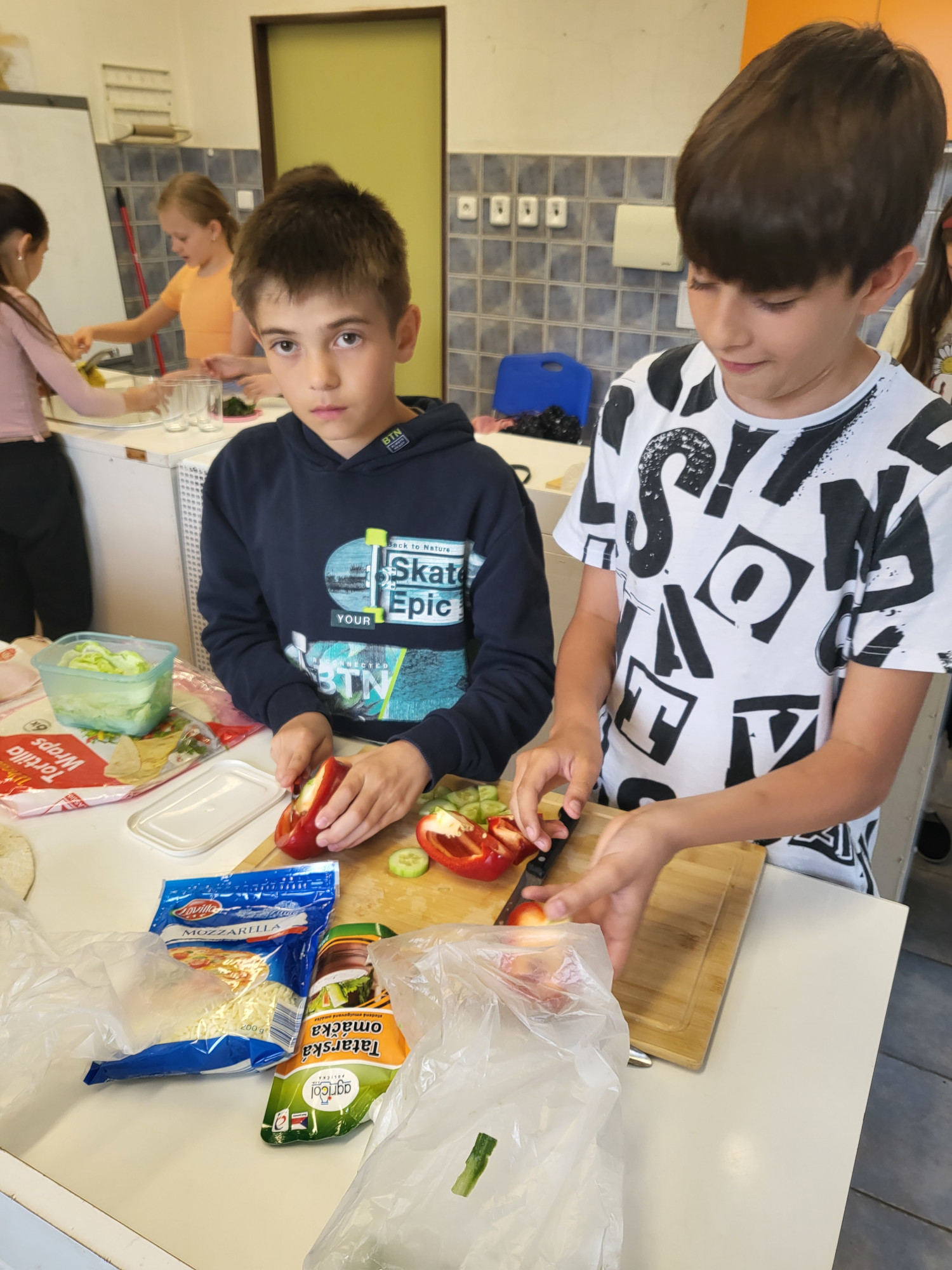 V páté třídě se biologii člověka a trávicí soustavu snažíme žákům co nejvíce přiblížit. Bavíme se o živinách, o tom, že je důležité jíst pravidelně, přiměřeně a pestře. Páťáci po úvodních hodinách měli za úkol vytvořit skupinky a vymyslet podle zadaných pravidel super jídlo pro školáka. Každá ze skupinek úkol pojala trošku jinak a vznikly tak skvělé jídla – ovesná kaše s ovocem, těstovinový salát s kuřecím masem, zeleninový salát s mozzarellou, tortilly nebo třeba sendviče s vajíčkem a zeleninou. Žákům se práce tak dařila a bavila je, že si vaření ještě brzy zopakujeme.