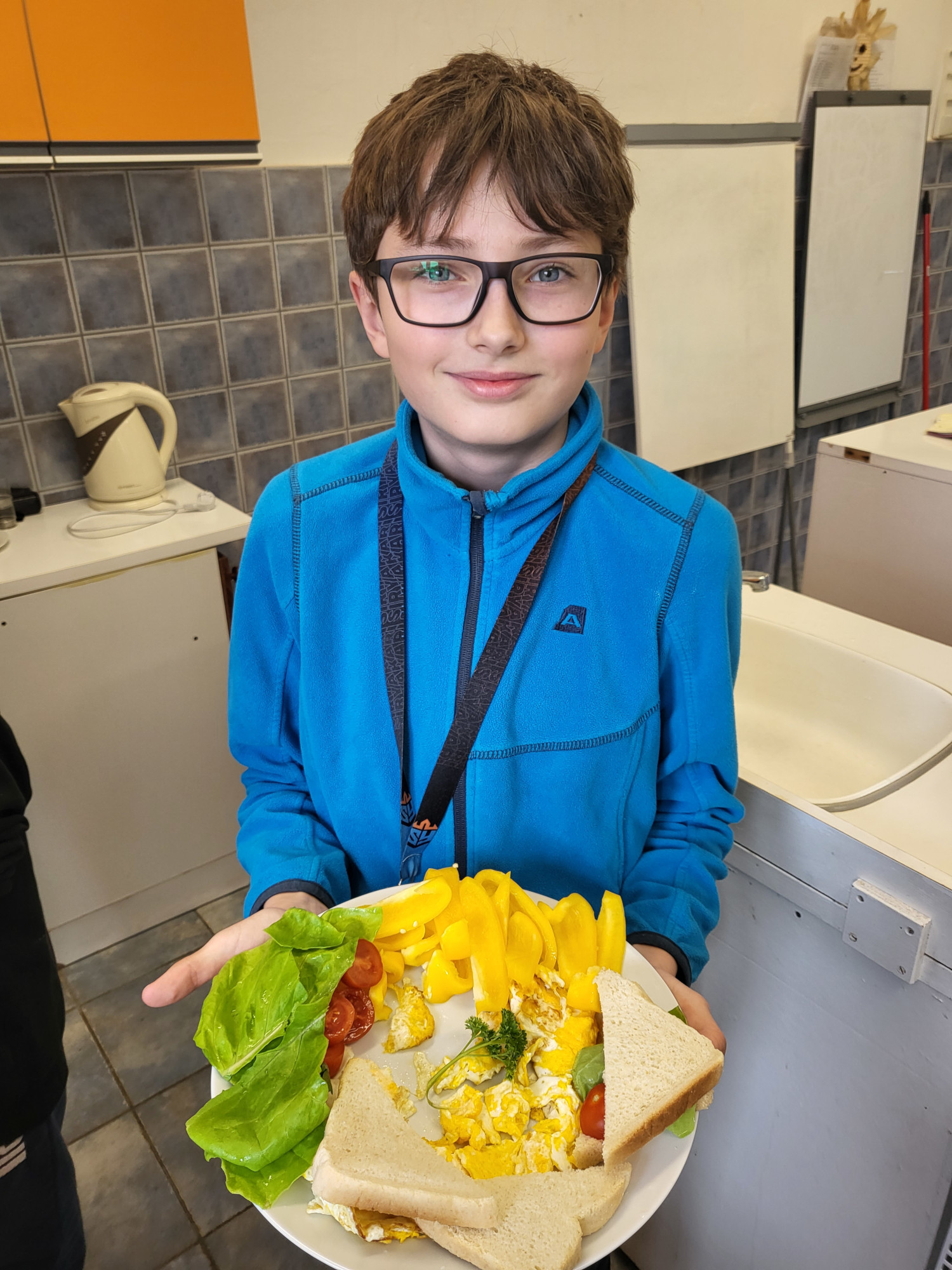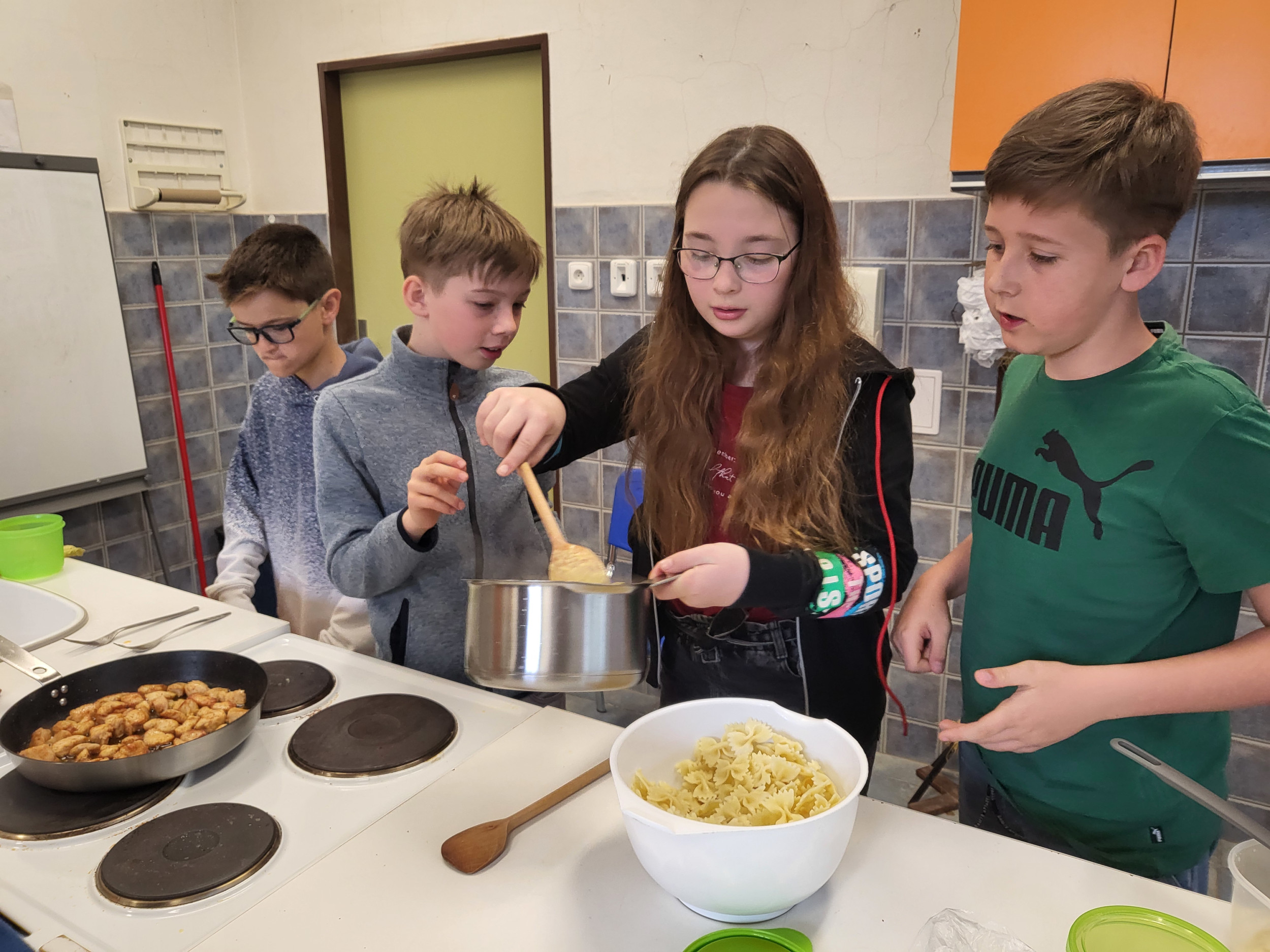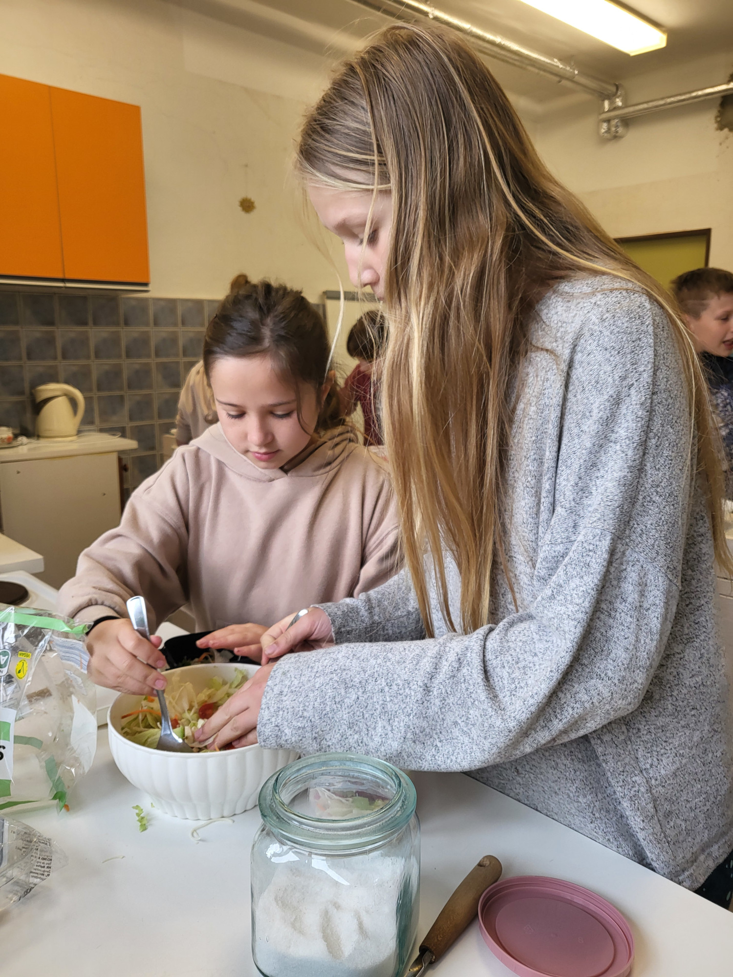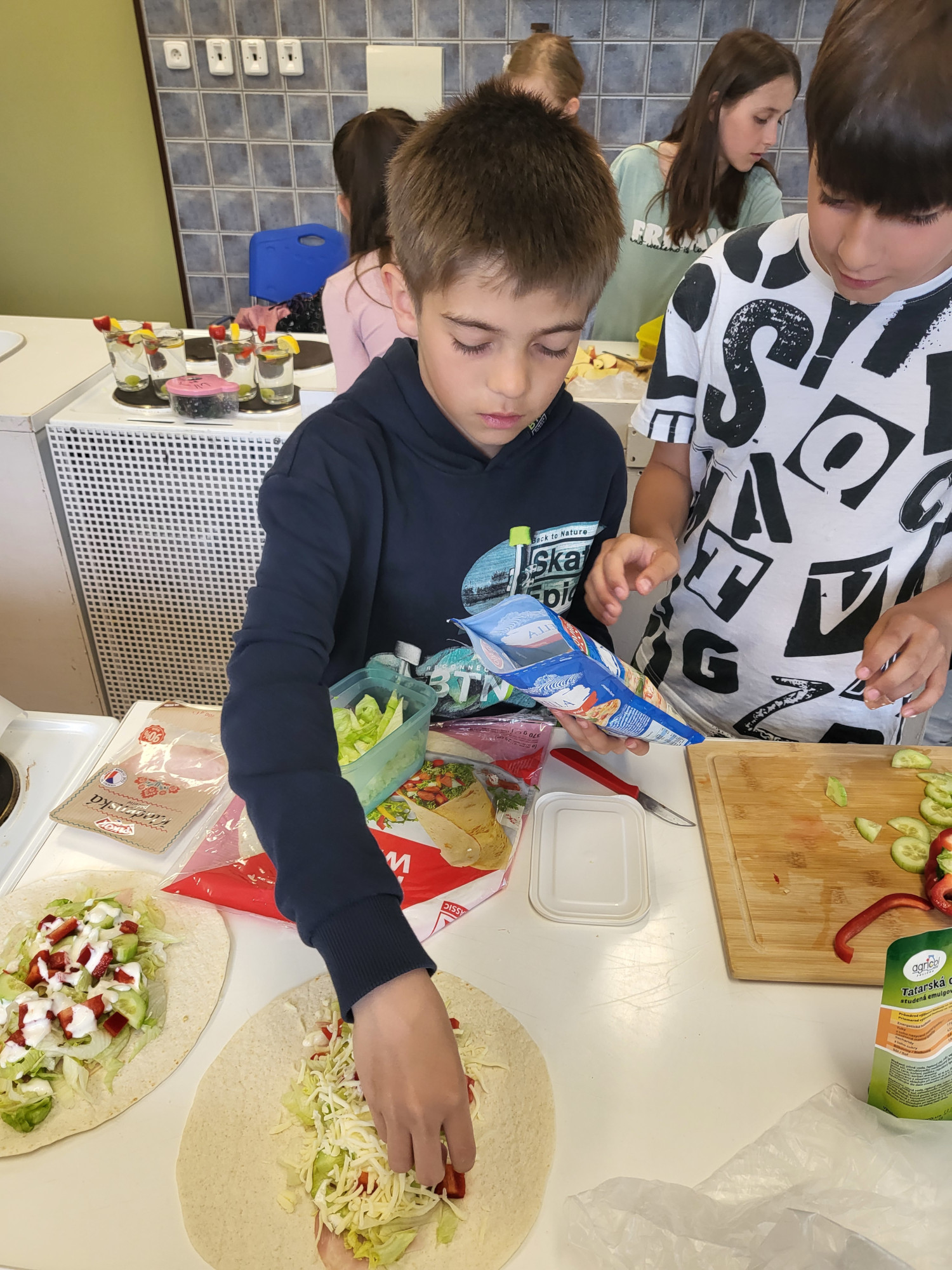 V páté třídě se biologii člověka a trávicí soustavu snažíme žákům co nejvíce přiblížit. Bavíme se o živinách, o tom, že je důležité jíst pravidelně, přiměřeně a pestře. Páťáci po úvodních hodinách měli za úkol vytvořit skupinky a vymyslet podle zadaných pravidel super jídlo pro školáka. Každá ze skupinek úkol pojala trošku jinak a vznikly tak skvělé jídla – ovesná kaše s ovocem, těstovinový salát s kuřecím masem, zeleninový salát s mozzarellou, tortilly nebo třeba sendviče s vajíčkem a zeleninou. Žákům se práce tak dařila a bavila je, že si vaření ještě brzy zopakujeme.
