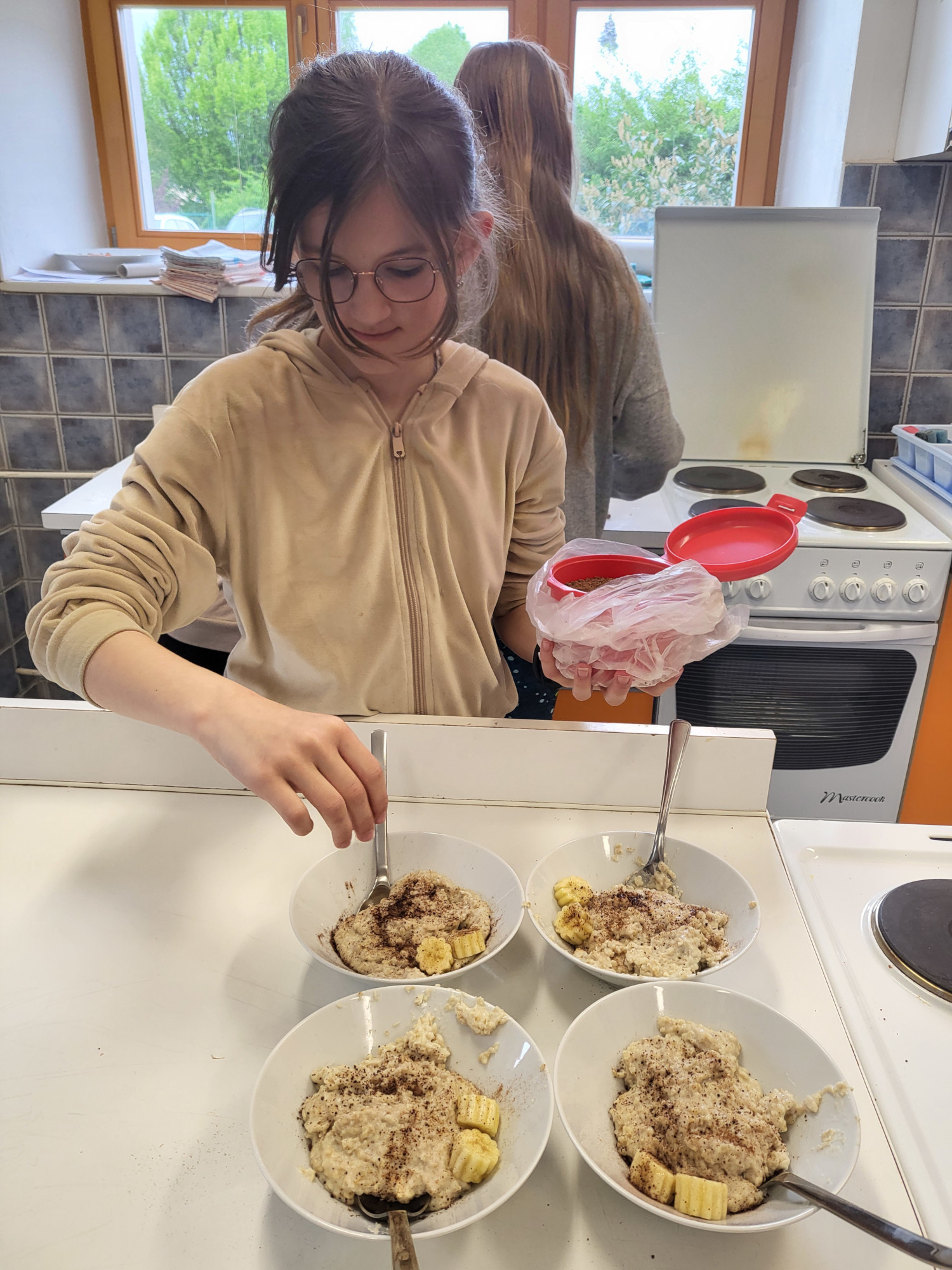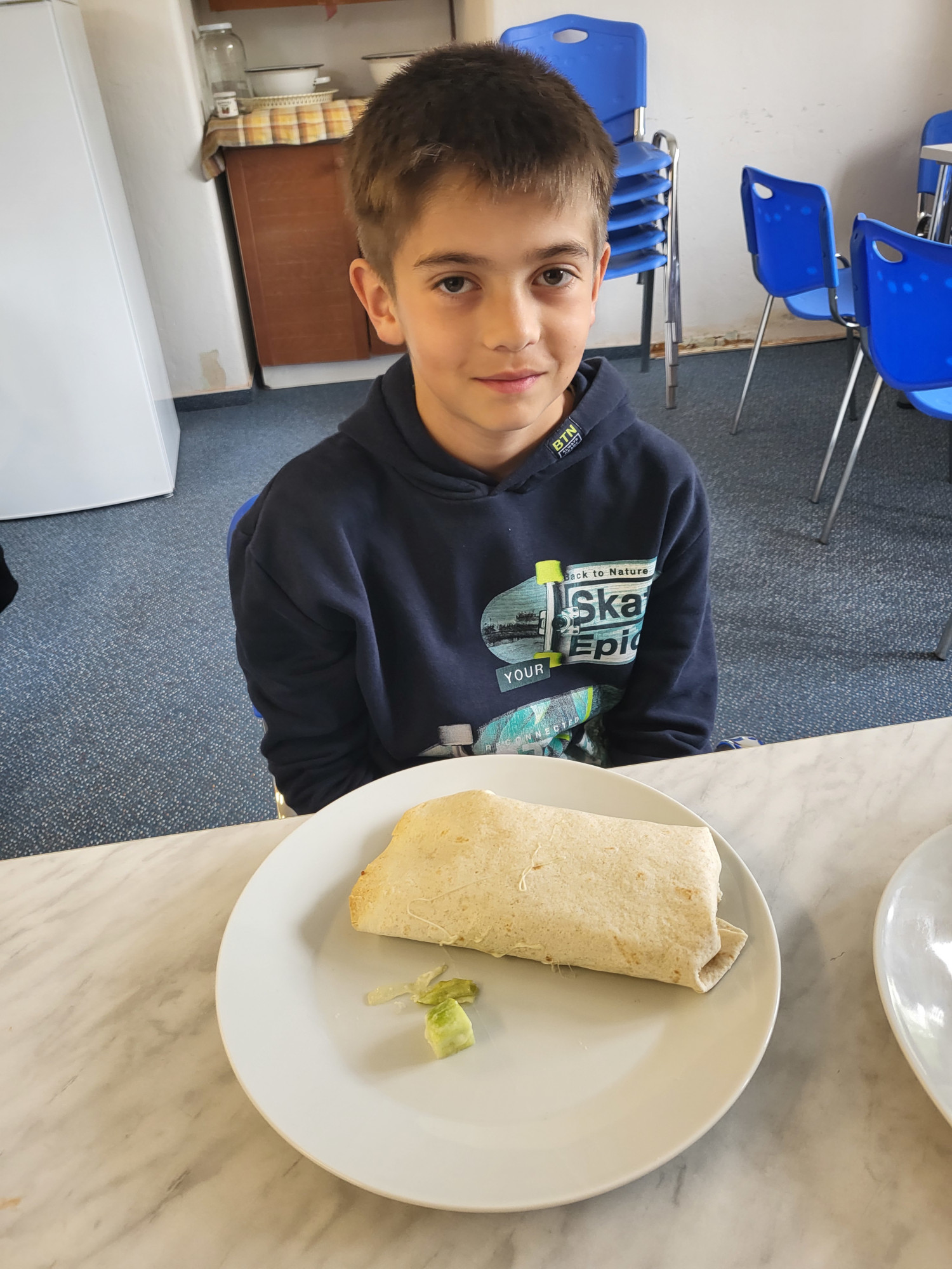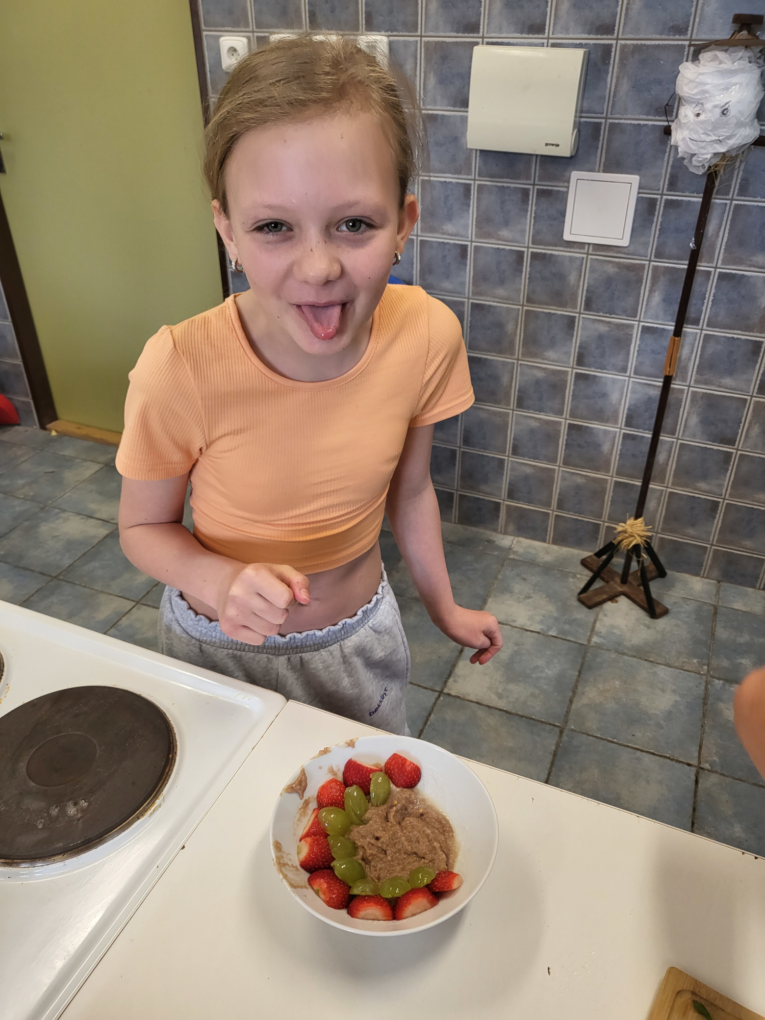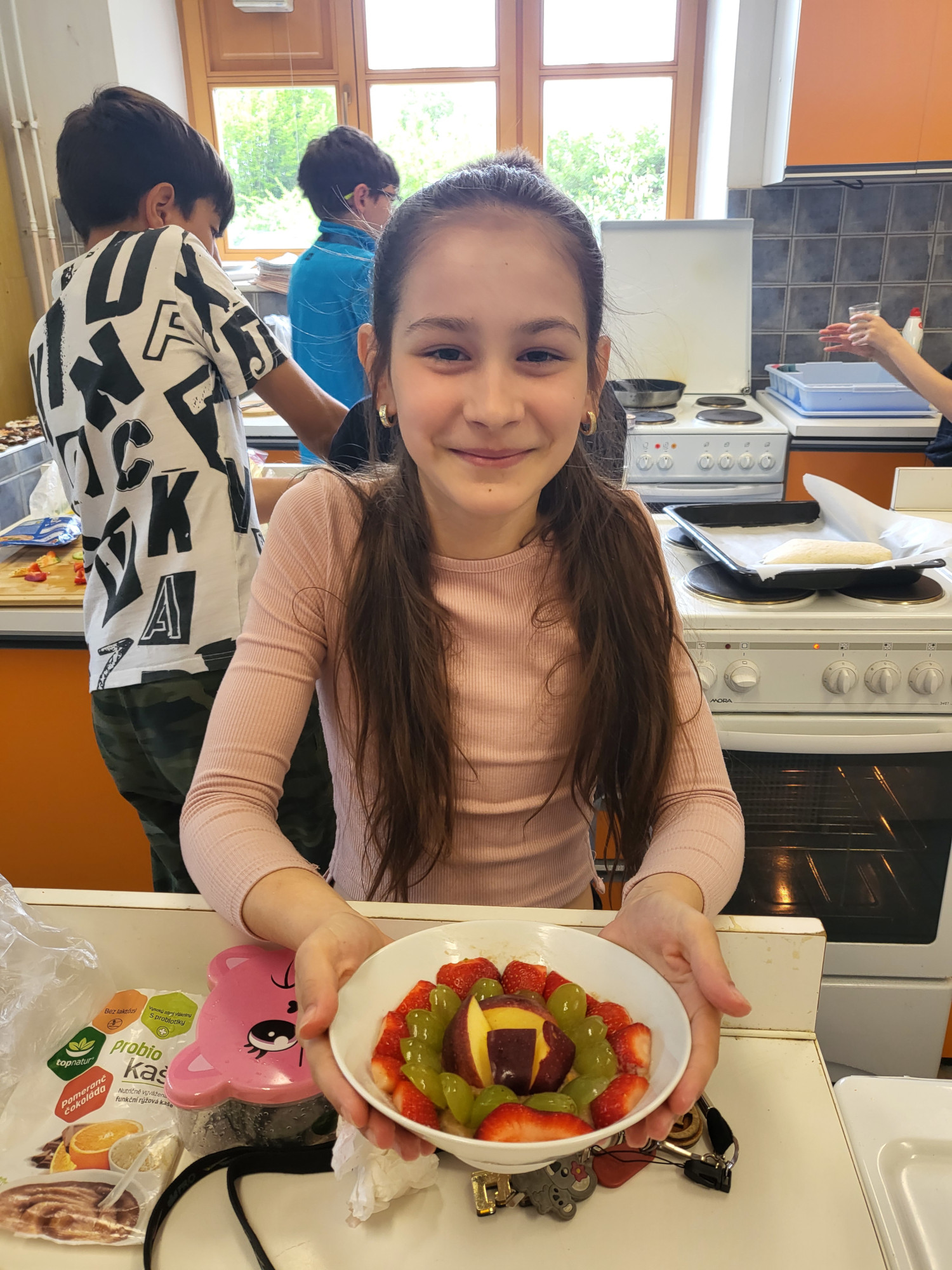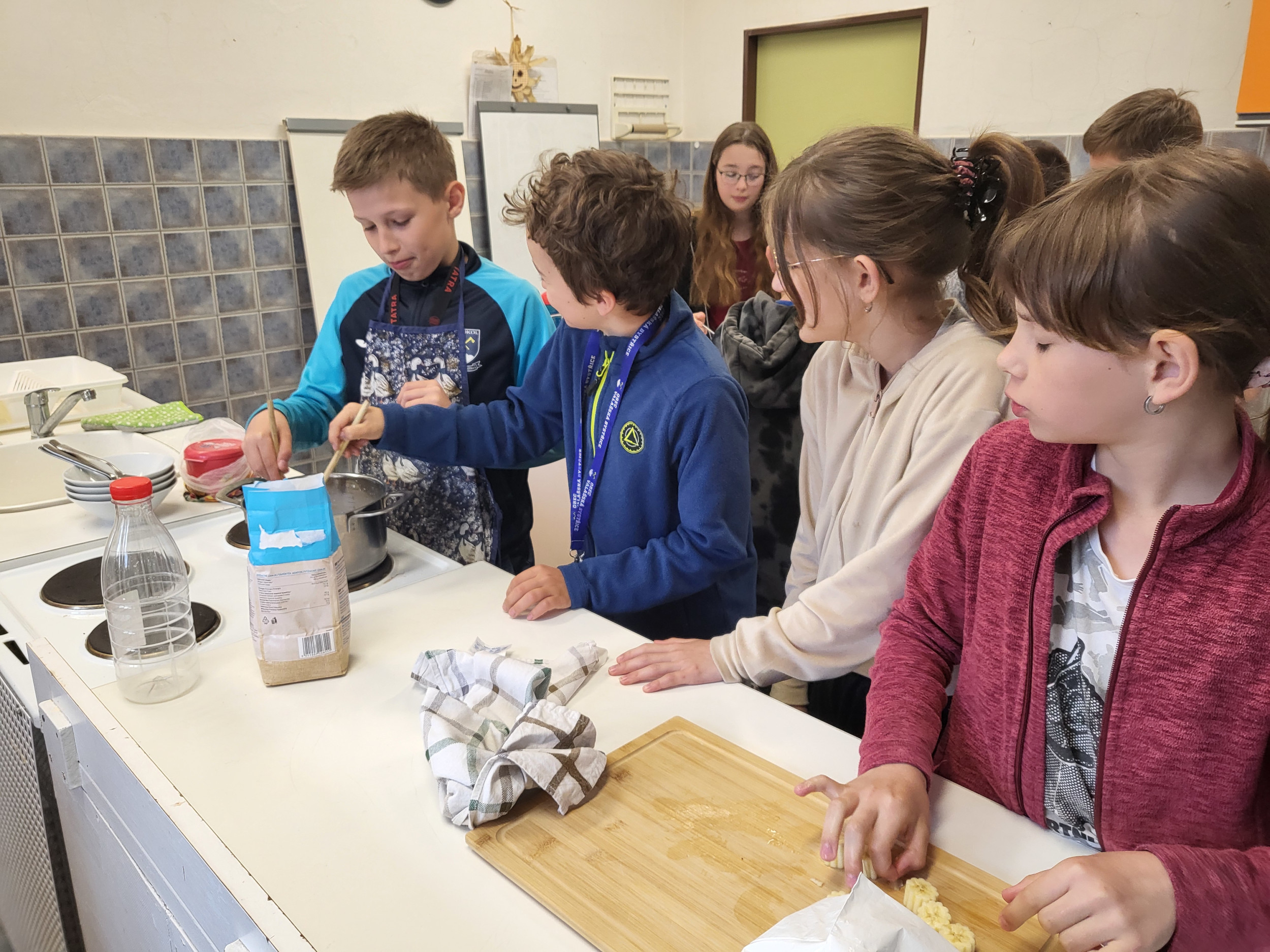 V páté třídě se biologii člověka a trávicí soustavu snažíme žákům co nejvíce přiblížit. Bavíme se o živinách, o tom, že je důležité jíst pravidelně, přiměřeně a pestře. Páťáci po úvodních hodinách měli za úkol vytvořit skupinky a vymyslet podle zadaných pravidel super jídlo pro školáka. Každá ze skupinek úkol pojala trošku jinak a vznikly tak skvělé jídla – ovesná kaše s ovocem, těstovinový salát s kuřecím masem, zeleninový salát s mozzarellou, tortilly nebo třeba sendviče s vajíčkem a zeleninou. Žákům se práce tak dařila a bavila je, že si vaření ještě brzy zopakujeme.